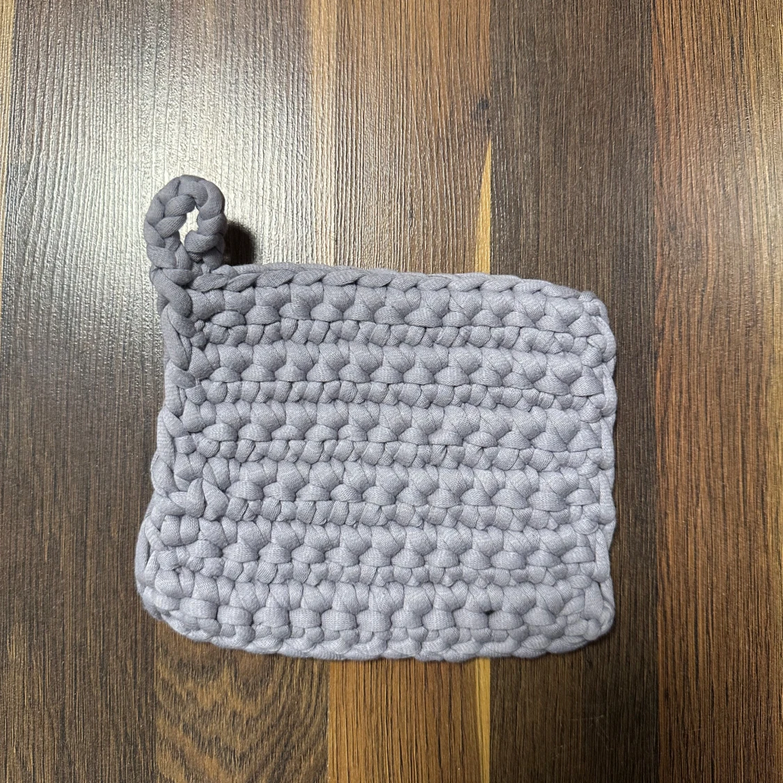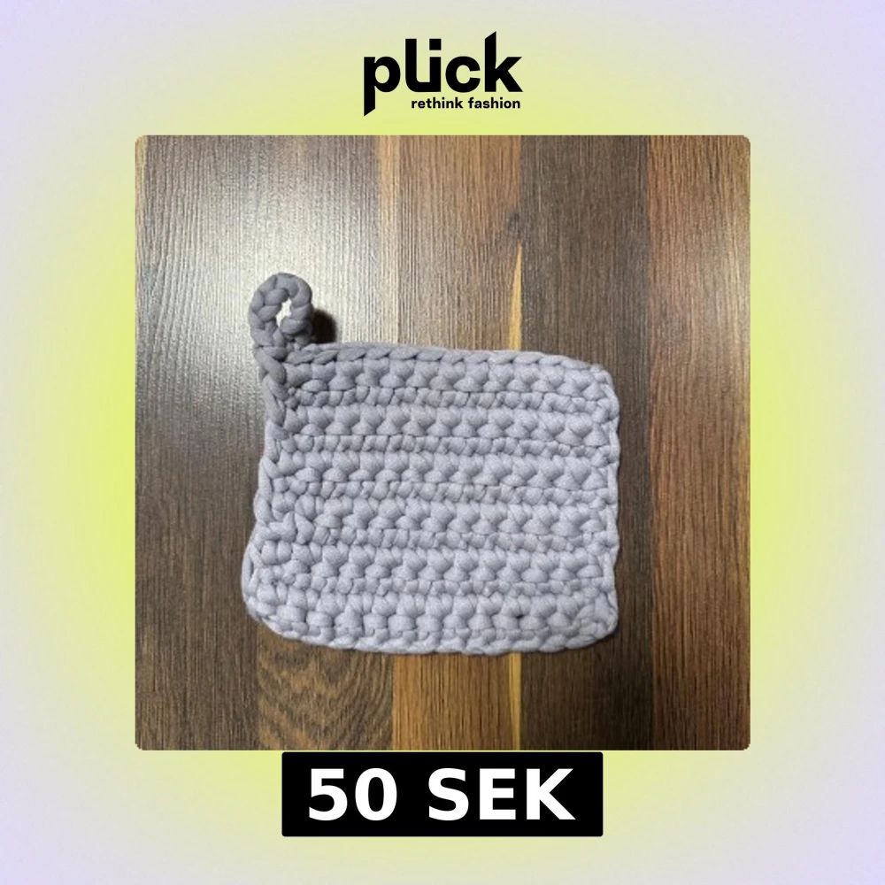 Ingen bok syns på bilden, endast en grå virkad grytlapp visas.