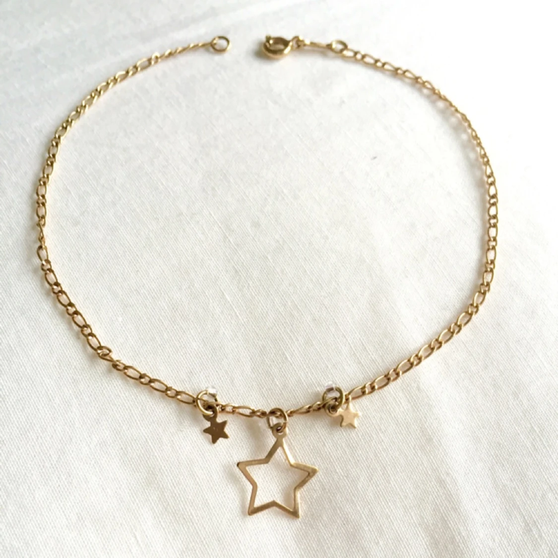 Guldpläterad fotlänk/armband (14k gf). Kedjan är ca 20 cm lång men kan låsas innan "slutöglan". Ser precis ny ut, trots att jag har ägt den i över 10 år! Fri frakt.