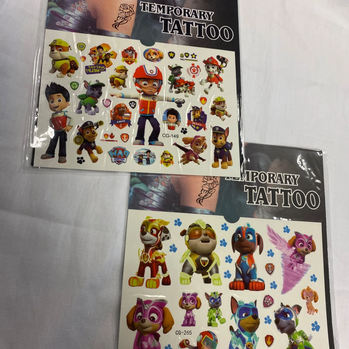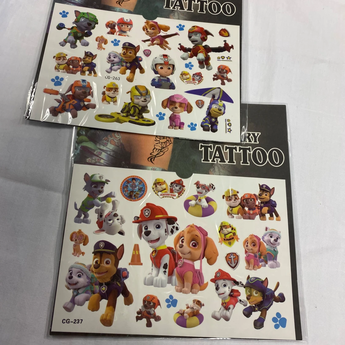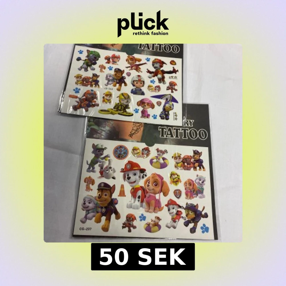 Två ark med tillfälliga tatueringar som visar olika hundkaraktärer i färgglada kläder och olika poser. Perfekt för barn som älskar djur och roliga motiv. Lätta att applicera och ta bort. 50kr/2st/ bild , samma frakt