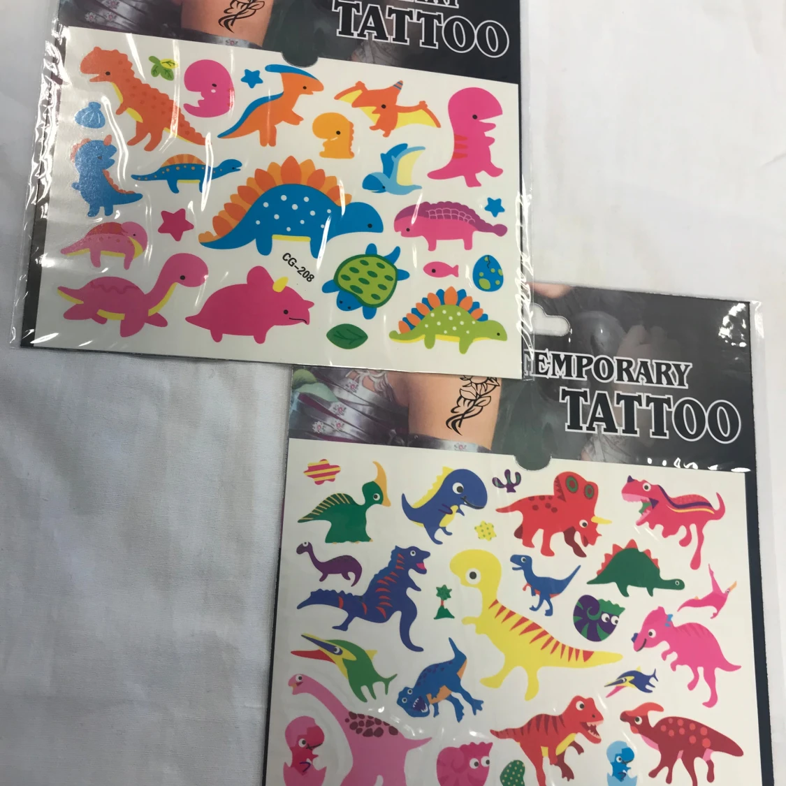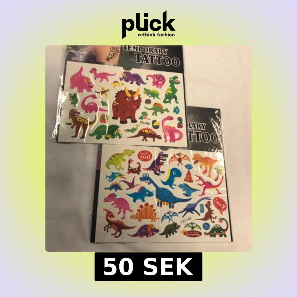Färgglada tillfälliga tatueringar med olika dinosauriemotiv. Perfekt för barnkalas eller som en rolig accessoar. Innehåller flera ark med olika dinosaurier i livliga färger som rosa, blå, grön och orange. 50kr/2st/bild , sammafrakt