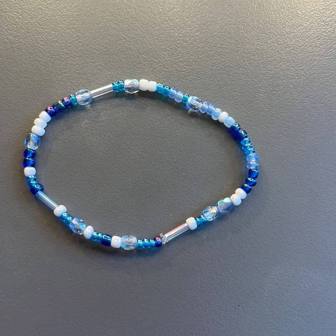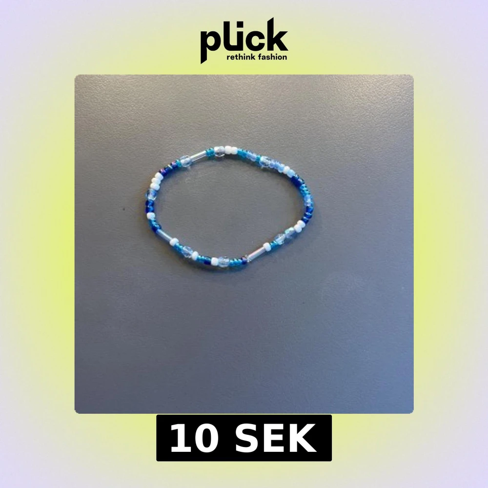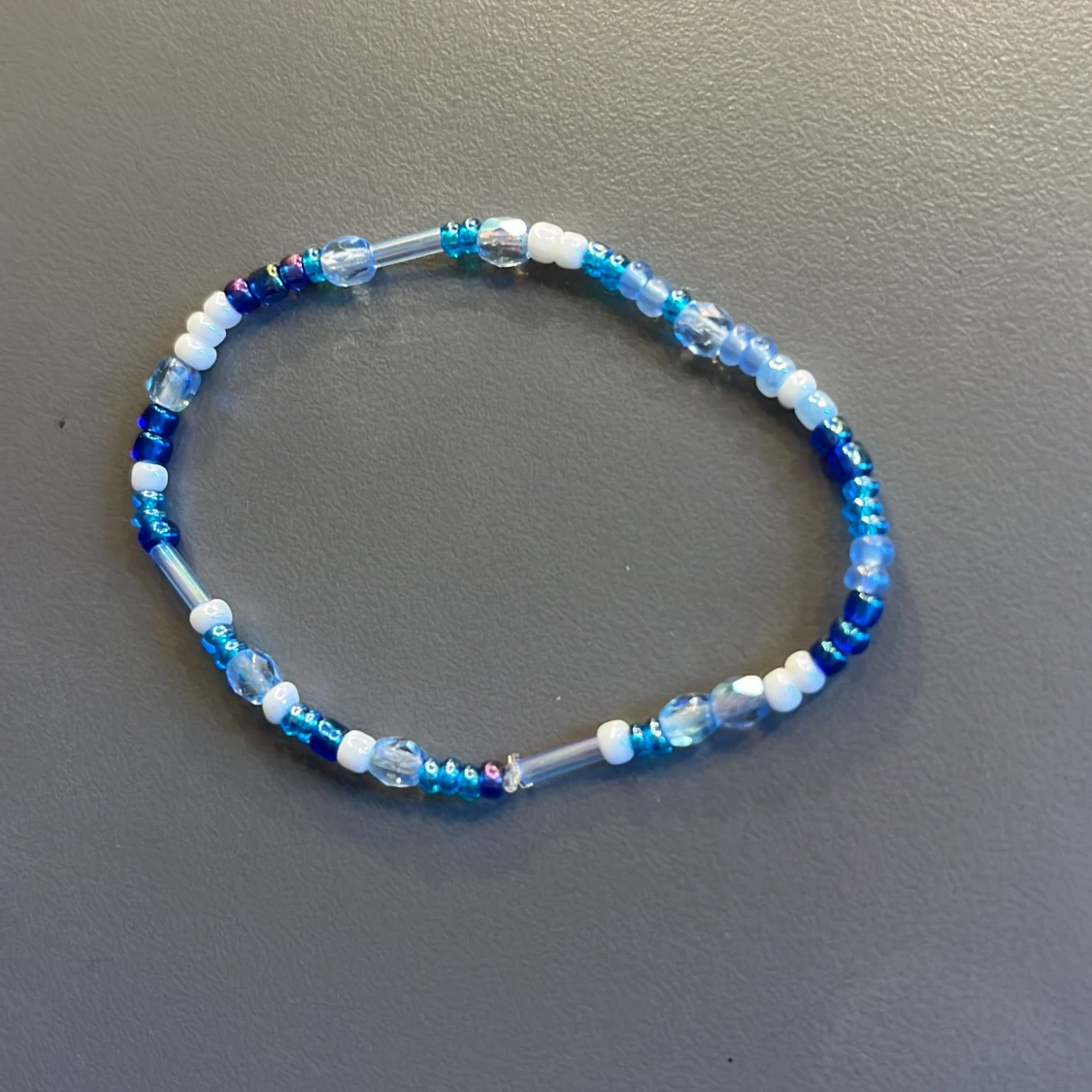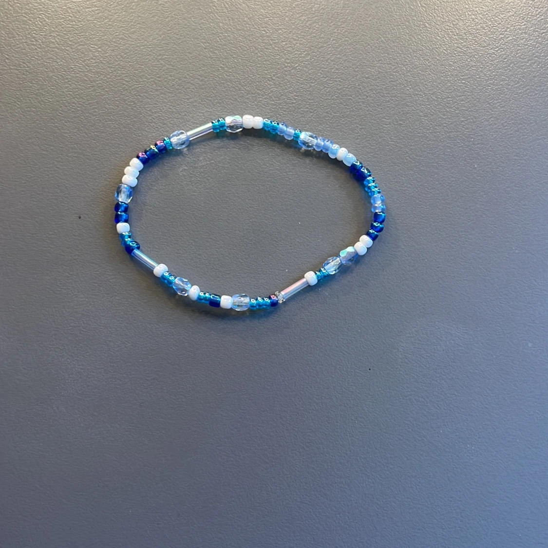 Säljer ett handgjort armband med små pärlor i olika nyanser av blått och vitt. Armbandet är elastiskt och består av både runda och avlånga pärlor som ger en fin variation.