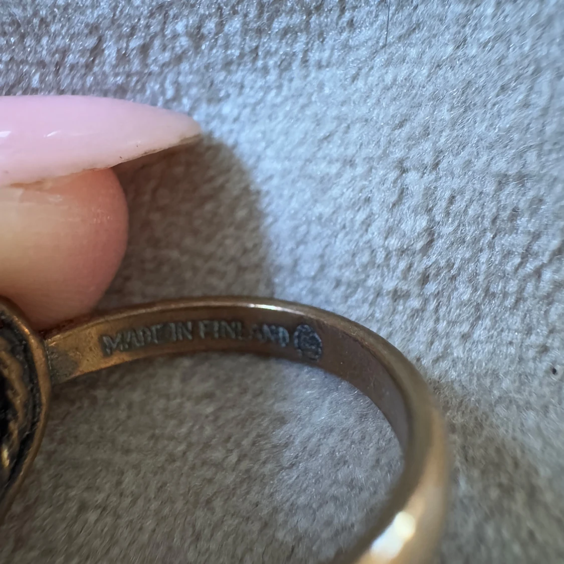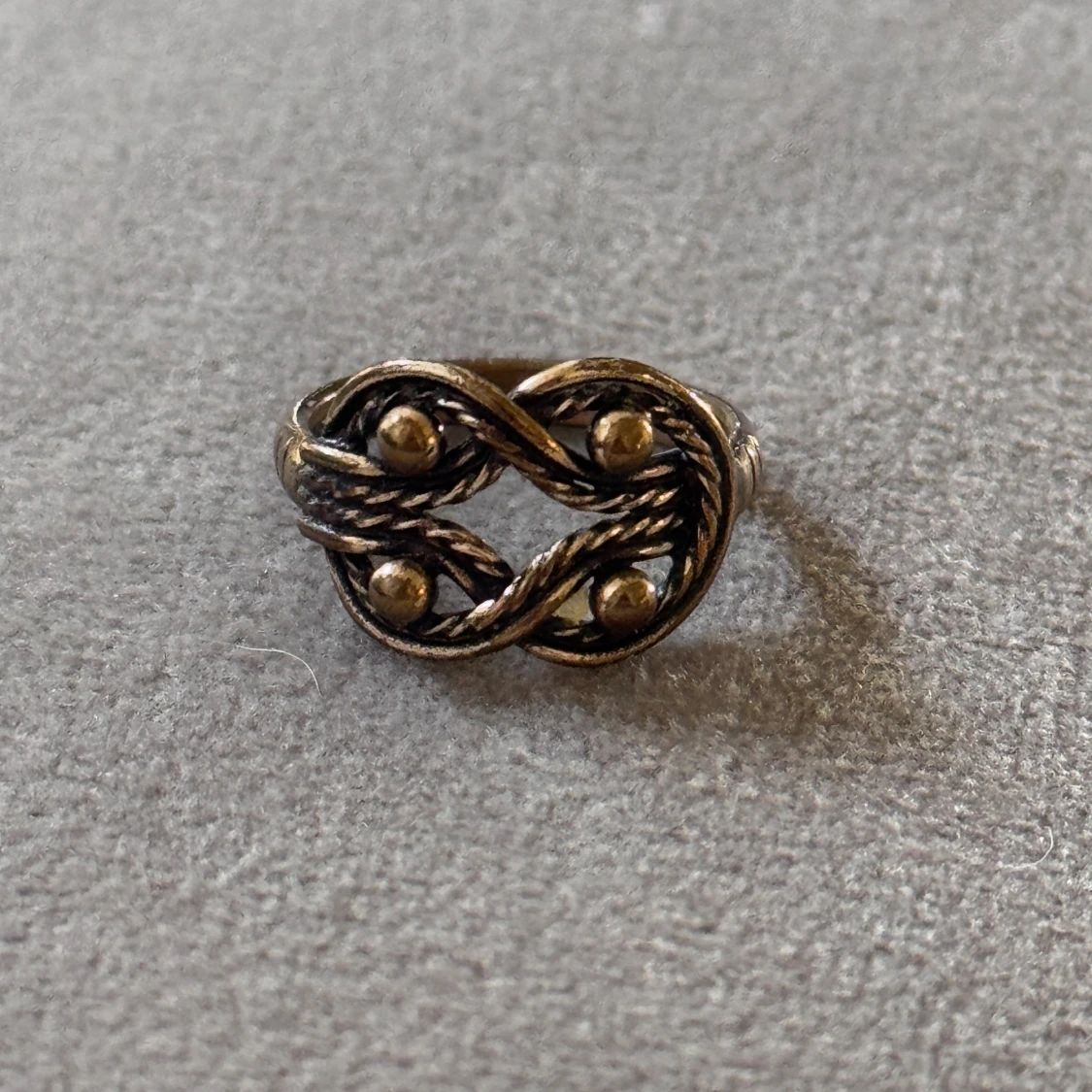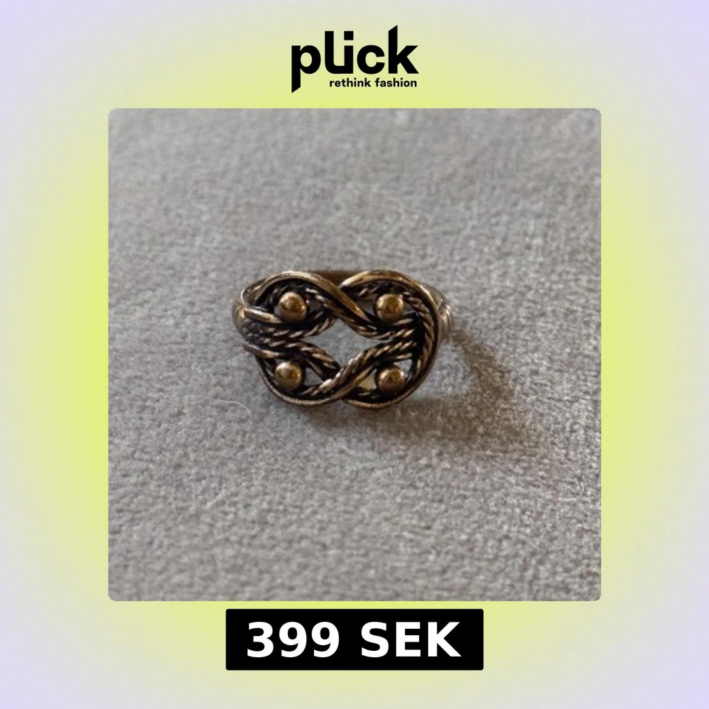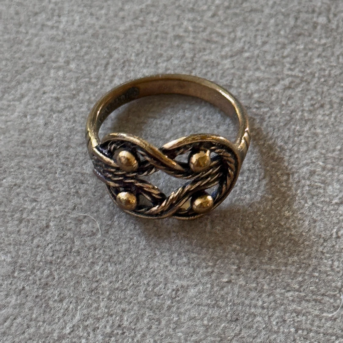 Unik ring från Kalevala tillverkad i Finland med flätad design och fyra små guldfärgade kulor. Ringen har en antik vibe med detaljerade snirkliga mönster och är i en varm guldton. Perfekt för dig som gillar statement-smycken med retrostil.