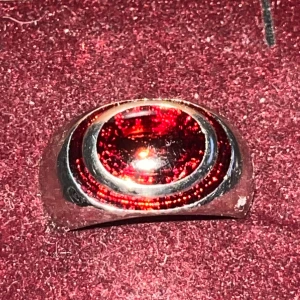 Elegant silverring med en stor, oval röd sten i mitten. Ringen har en bred design som ger ett kraftfullt intryck. Perfekt för att ge en färgklick till din outfit.