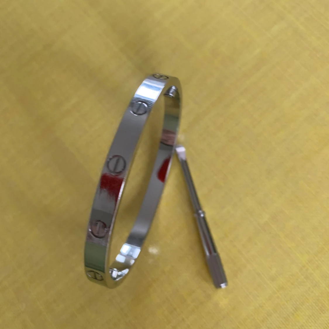 Elegant silverfärgat armband med ikoniska skruvdetaljer runt om. Armbandet har en slät och blank yta och kommer med ett verktyg för att öppna och stänga det. Perfekt för att ge en stilren touch till din look.