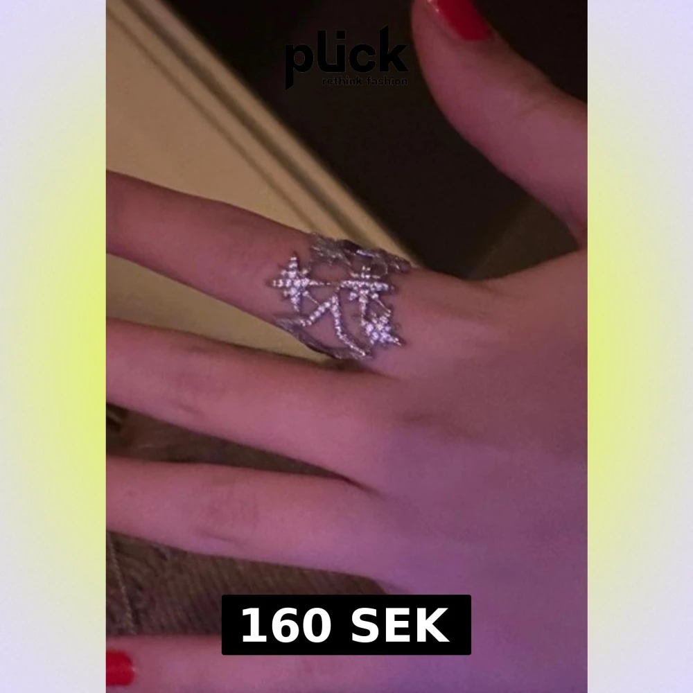 Säljer en cool och unik silvrig ring med flera små stjärnor som sitter ihop i ett öppet mönster. Ringen har en glittrig finish som gör den extra iögonfallande och passar perfekt om du gillar statement-smycken med lite edge.