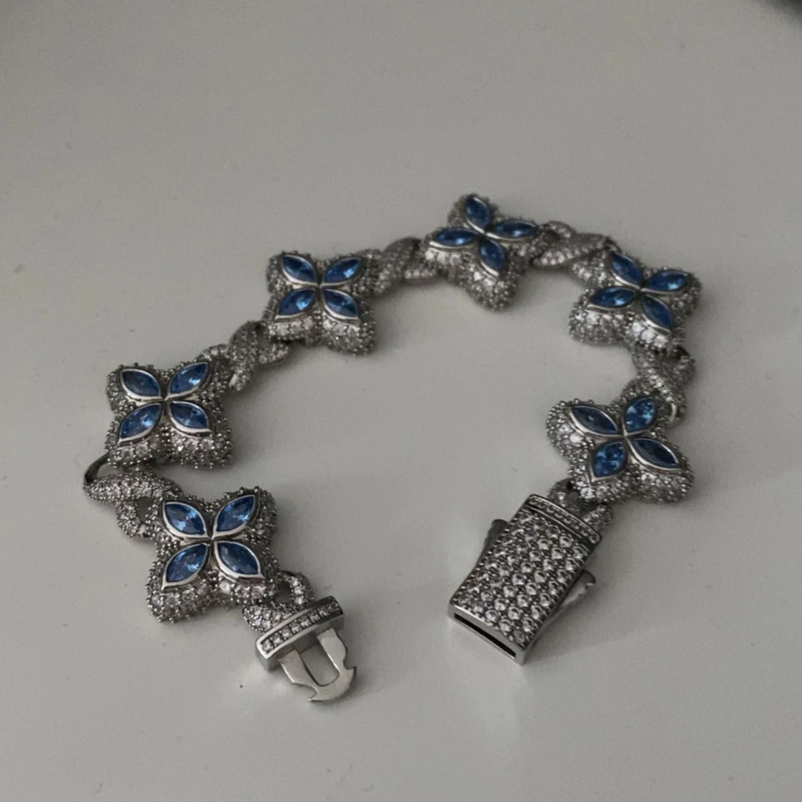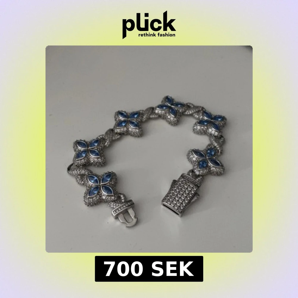 Snyggt armband i silverfärg med blommiga former och blå glittriga stenar. Armbandet har detaljerade länkar och varje blomma är dekorerad med fyra blå stenar omgivna av små gnistrande stenar. Perfekt för dig som gillar unika och iögonfallande smycken.
