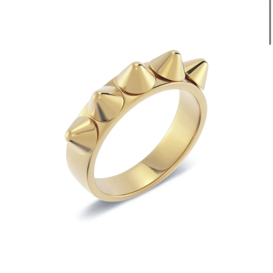 Stilren guldfärgad ring dekorerad med spetsiga nitar runtom. Perfekt för att ge en edgy touch till din stil. Passar både till vardag och speciella tillfällen. Priset går att diskutera 🥰