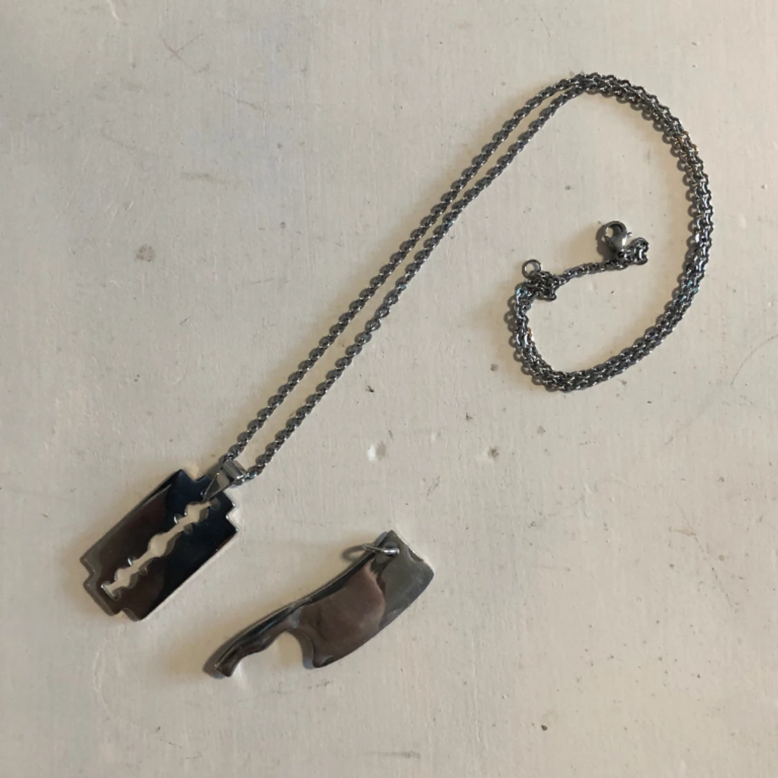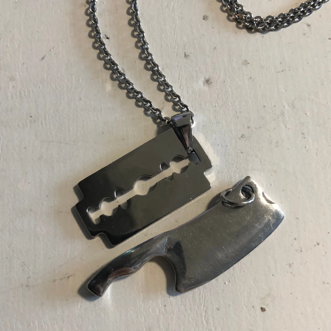 Ett smycke med två hängen, en kniv och ett rakblad. Silver aldrig använt.