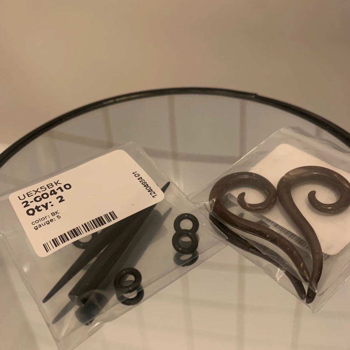 Helt oanvända töjningar pågrund av fel storlek.🥴 Paret till vänster är i akryl och är 4,6cm lång, tjocklek 5mm. Paret till höger är gjort i organiskt material och är 4,3cm lång, tjocklek 5mm. 💕