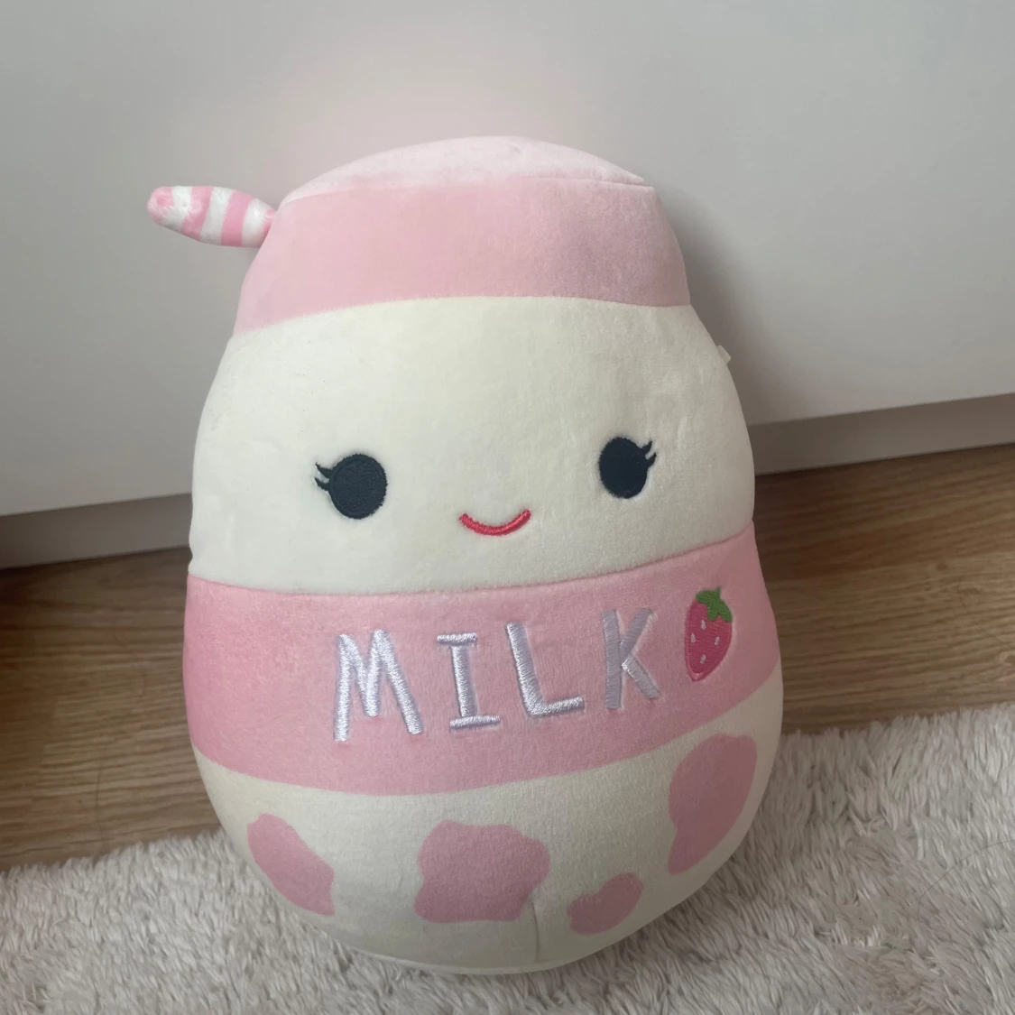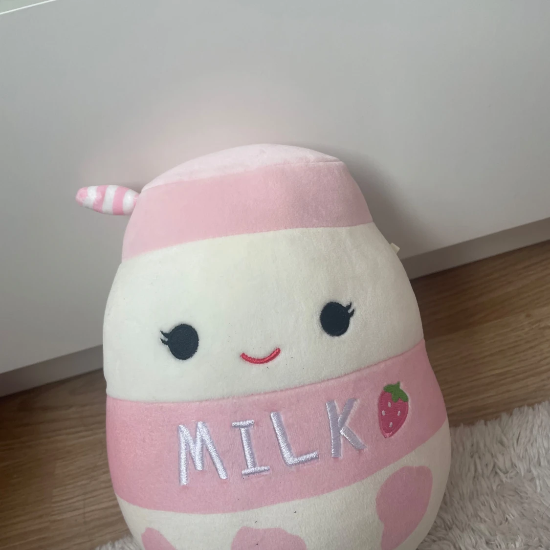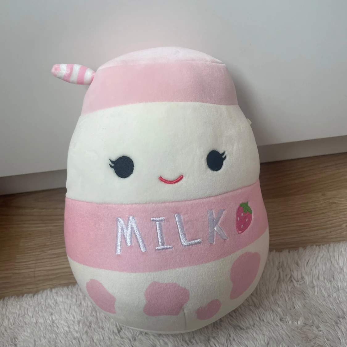 Säljer en söt Squishmallows mjukisdjur formad som en mjölkflaska. Den har en rosa och vit design med ordet 'MILK' broderat och en liten jordgubbe. Perfekt för kramar och dekoration! 🍼🍓