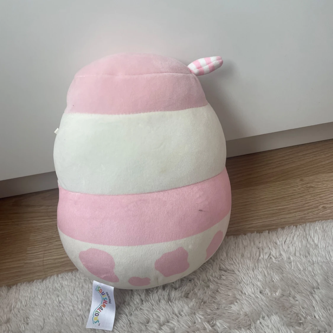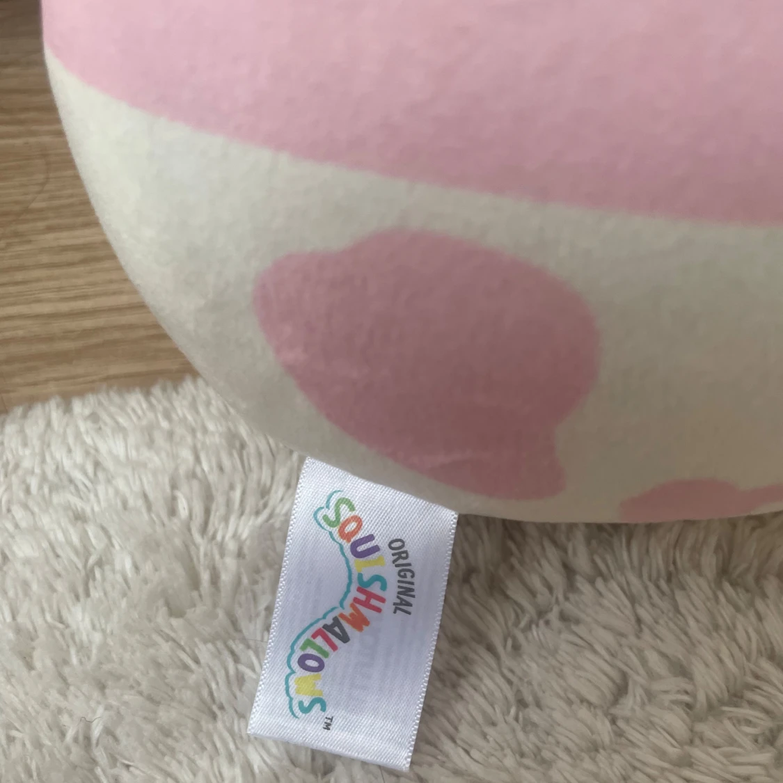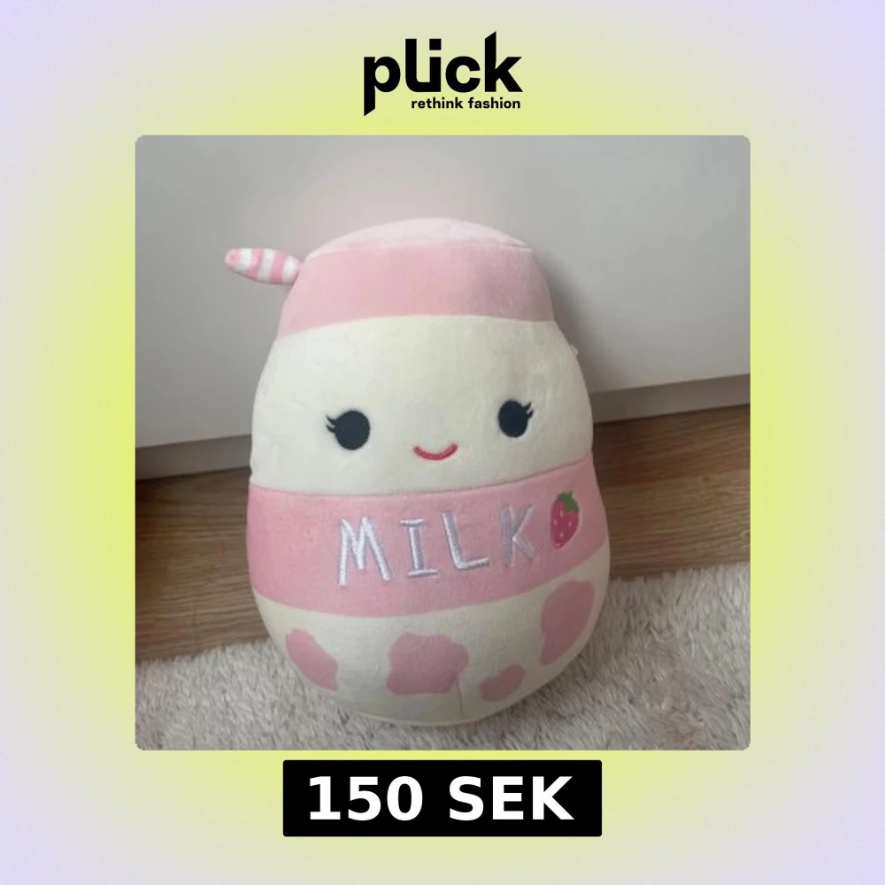 Säljer en söt Squishmallows mjukisdjur formad som en mjölkflaska. Den har en rosa och vit design med ordet 'MILK' broderat och en liten jordgubbe. Perfekt för kramar och dekoration! 🍼🍓