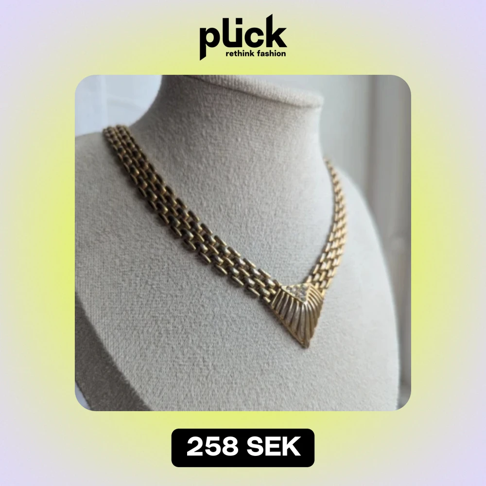 Säljer ett elegant guldigt halsband med en unik design. Halsbandet har en vacker triangulär detalj i mitten med små gnistrande kristaller. Kedjan är robust och har en fin länkdesign som ger en lyxig känsla. Perfekt för att lyfta vilken outfit som helst!