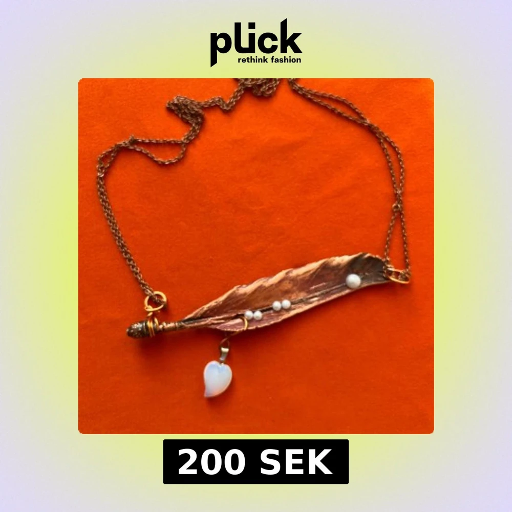 Unikt halsband med ett kopparfärgat elektropläterat fågelfjäderbladshäng, dekorerat med små vita pärlor och ett vitt hjärtformat hänge. Kedjan är gjord av metall och har en varm vintagelook.
