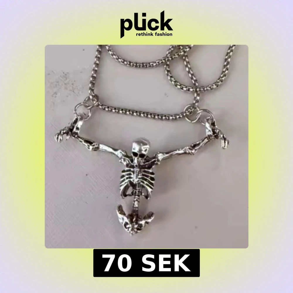 Helt ny Unikt halsband i silverfärgad metall med en cool skelettfigur som hänger i kedjan. Skelettet har detaljerade ben, revben och skalle, och kedjan är grov och robust. Perfekt för dig som gillar edgy och annorlunda smycken med attityd.