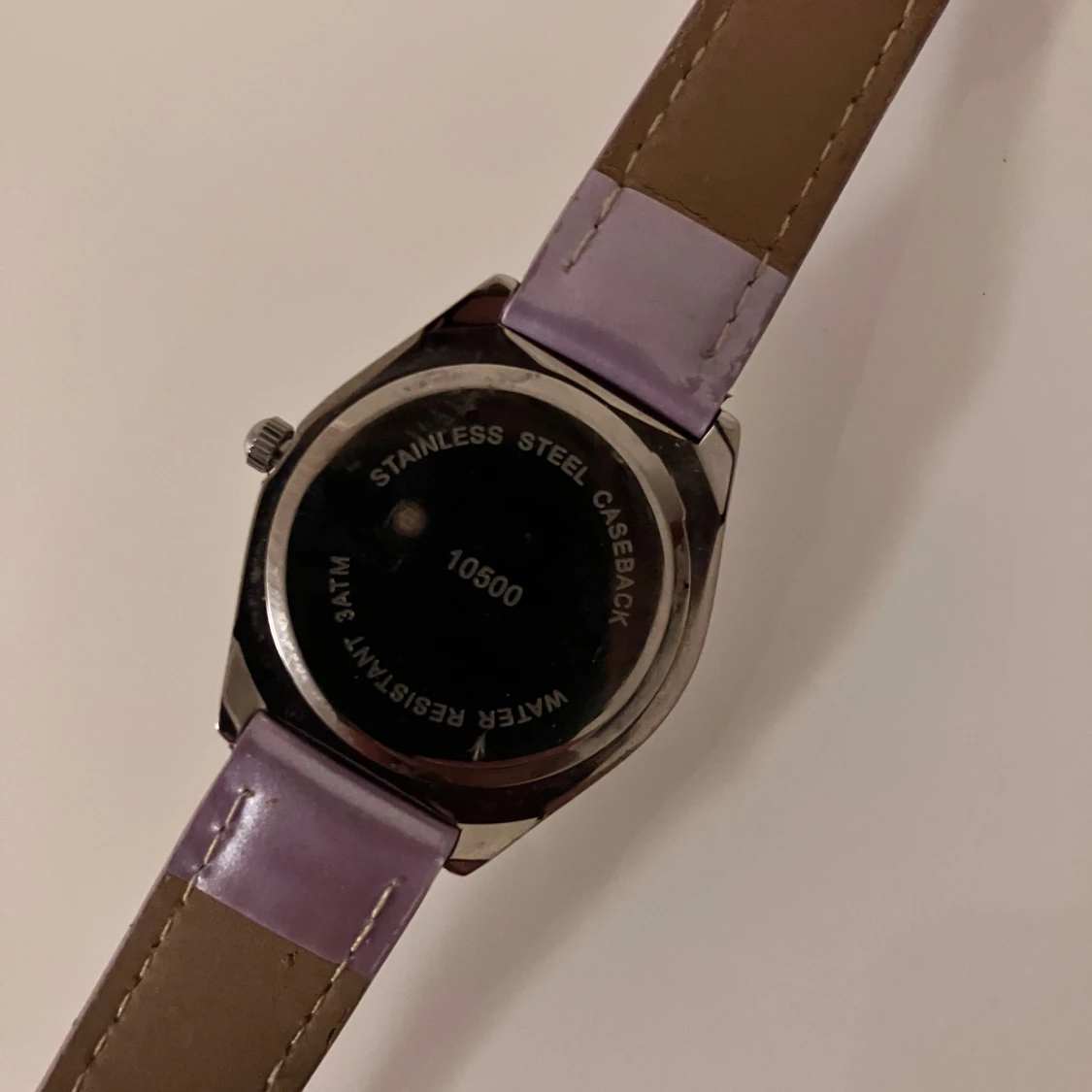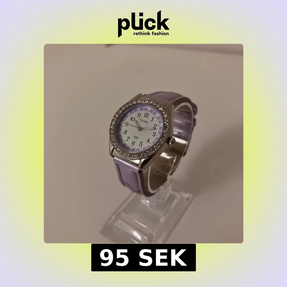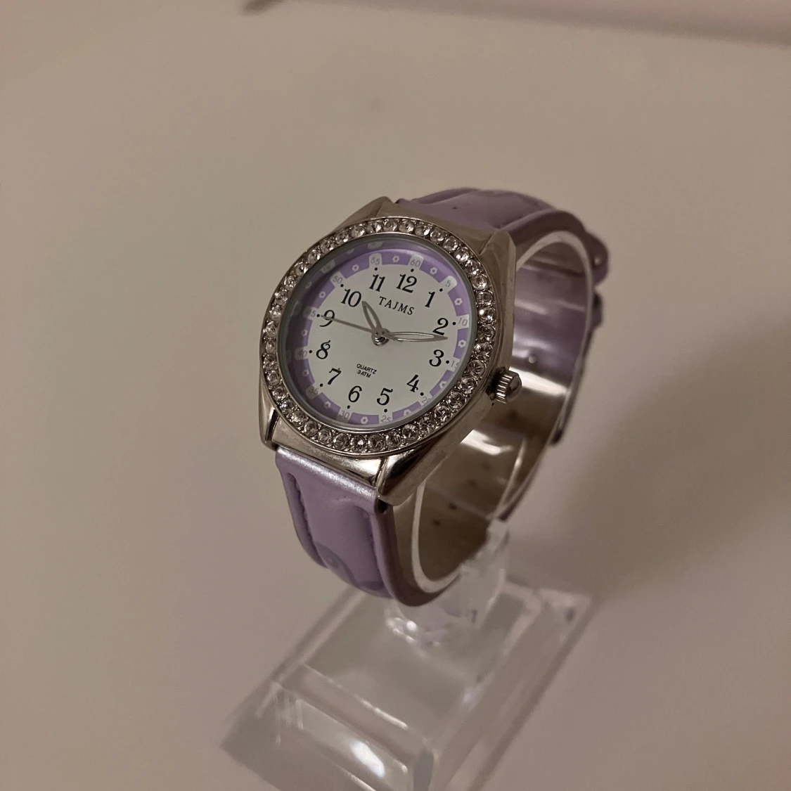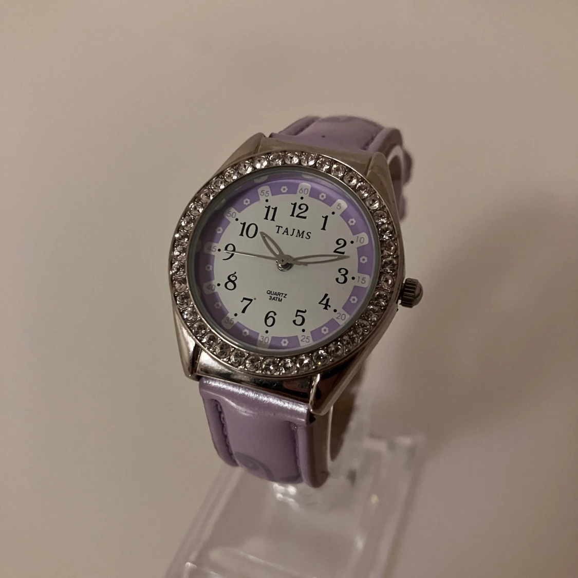 Snygg klocka från TAJMS med lila armband i syntetmaterial och blommigt mönster. Urtavlan är vit med lila detaljer och silverfärgade siffror. Runt boetten sitter glittrande stenar som ger extra bling. Perfekt accessoar för dig som gillar färg och detaljer. Behöver ett nytt batteri .