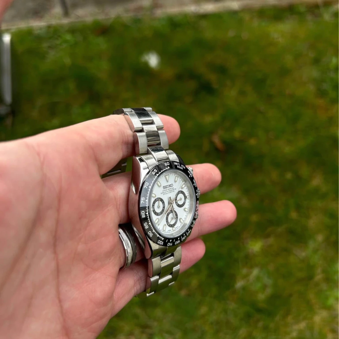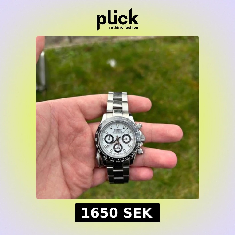 Säljer en snygg Seiko kronografklocka med en stilren silverfärgad boett och armband. Urtavlan är vit med tre sub-dials och svarta detaljer. Perfekt för den som gillar en klassisk och tidlös design.