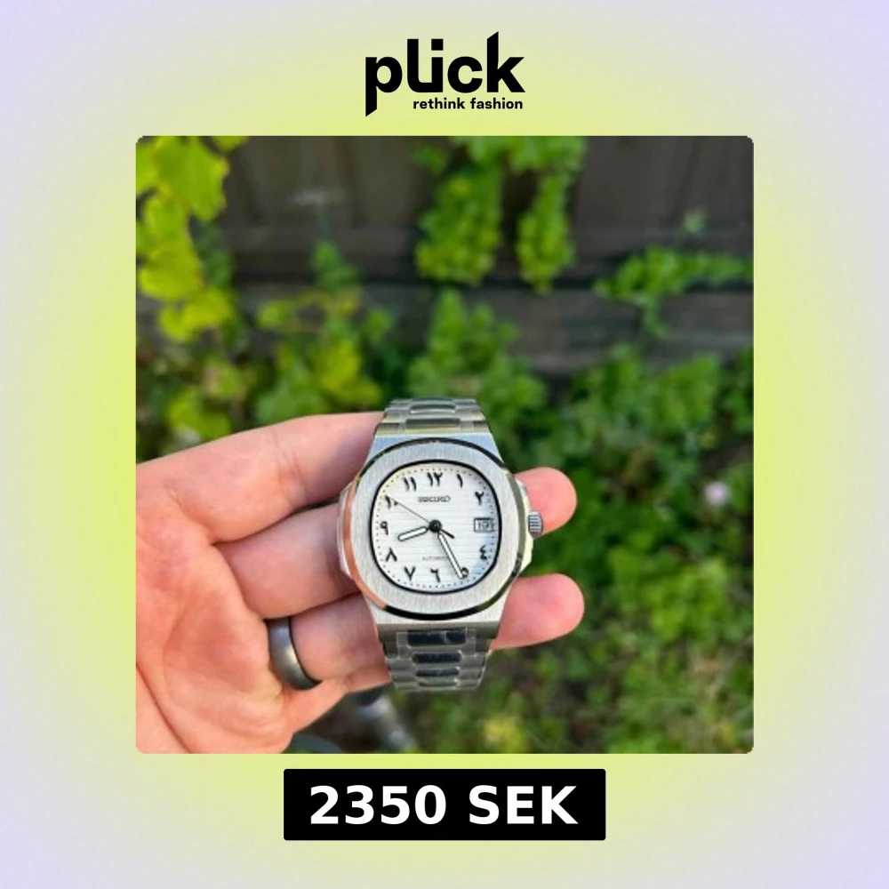 Säljer en elegant Seiko-klocka med automatisk urverk och datumvisning. Klockan har en vit urtavla med svarta markeringar och en robust silverfärgad länkarmband. Perfekt för den stilmedvetna som vill ha en tidlös accessoar.