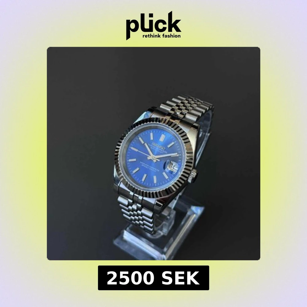 Stilren Seiko automatisk klocka med blå urtavla och datumfönster. Boetten och länken är i silverfärgat rostfritt stål med räfflad bezel och klassisk länkdesign. Tydliga index och visare i silver ger en modern och clean look. Perfekt accessoar för dig som gillar snygga detaljer.