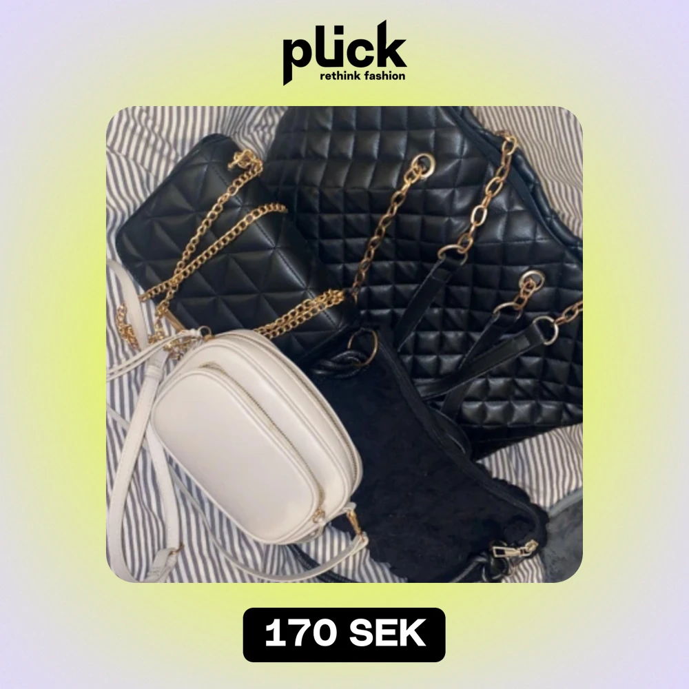 Fint skick! Förutom den stora dragkedjan har gått sönder på den. Stora väskan:80kr Liten svart väska med guld kedja: 30kr Liten svart väska: 30kr Biege väska: 30kr Alla 170kr