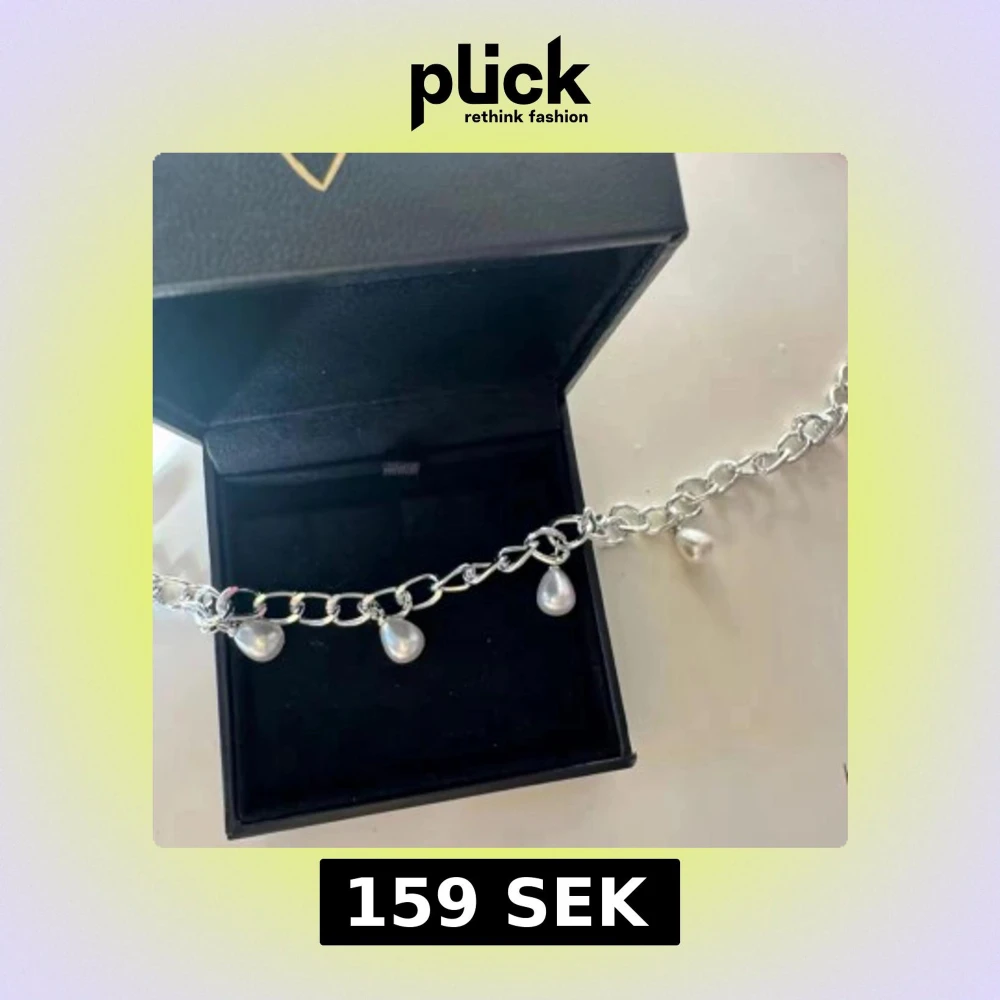 Stilrent halsband i silverfärgad kedja med fem droppformade pärlor som hänger längs kedjan. Perfekt för att ge en cool och elegant touch till din outfit.