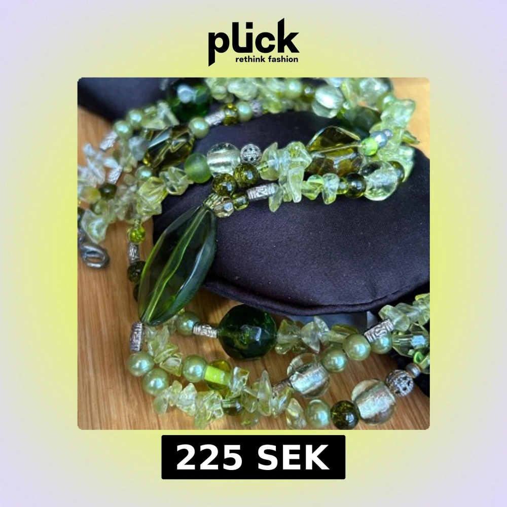 Unikt och vackert handgjort 3-layerhalsband med gröna glasstenar i olika former. Längd: 40 cm. I nyskick.