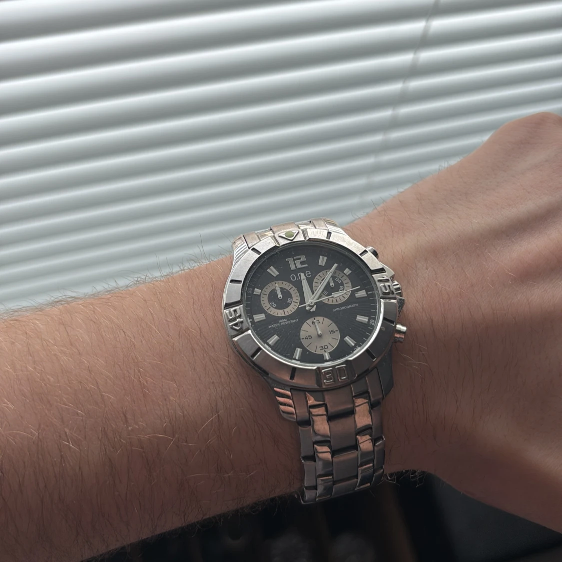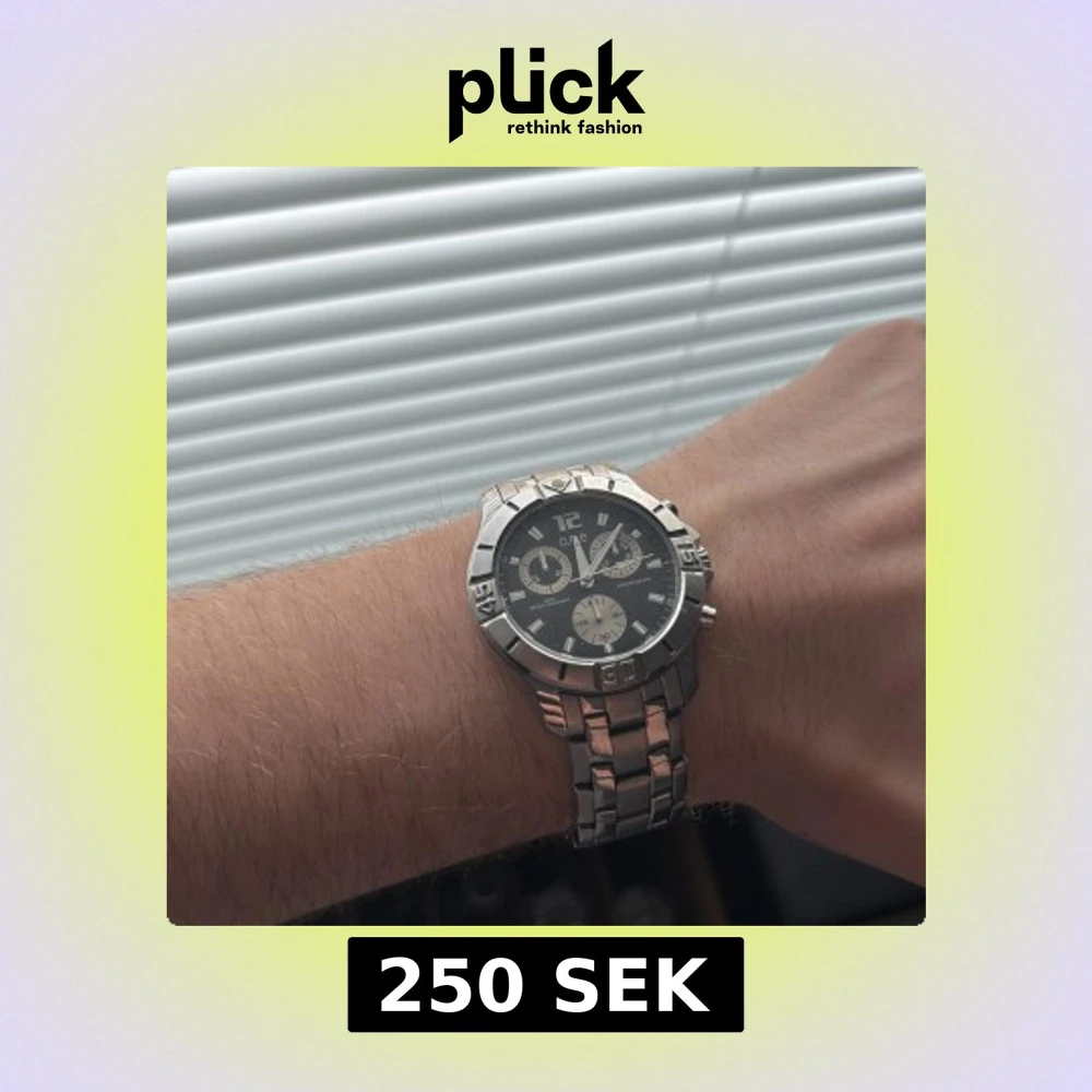 Snygg silverfärgad klocka med robust länkarmband och en mörk urtavla. Klockan har tydliga markeringar och flera små urtavlor för extra funktioner. Perfekt för den som gillar en stilren och klassisk look.
