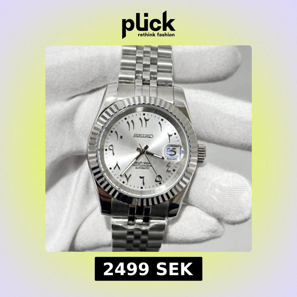 Snygg Seiko automatisk klocka i helsilver med arabiska siffror på urtavlan. Klockan har en robust länk i rostfritt stål, räfflad bezel och datumfönster med förstoringsglas. Stilren och modern design som sticker ut på handleden.
