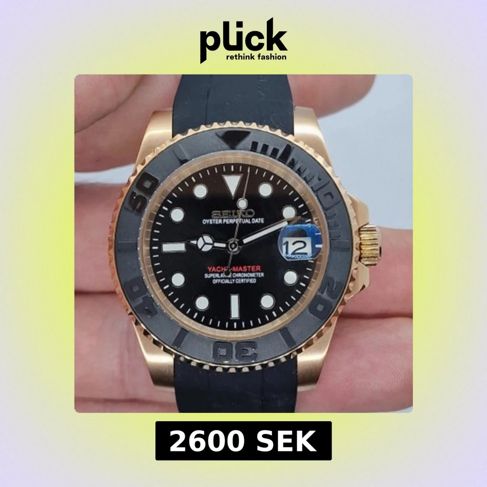 Stilren Seiko Yacht-Master med svart urtavla, tydliga vita index och datumfönster. Boetten är i guldton och har en svart vridbar bezel. Klockan har svart silikonarmband och sportig känsla. Perfekt för dig som gillar snygga detaljer och klassisk design.