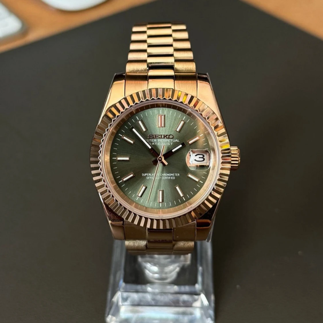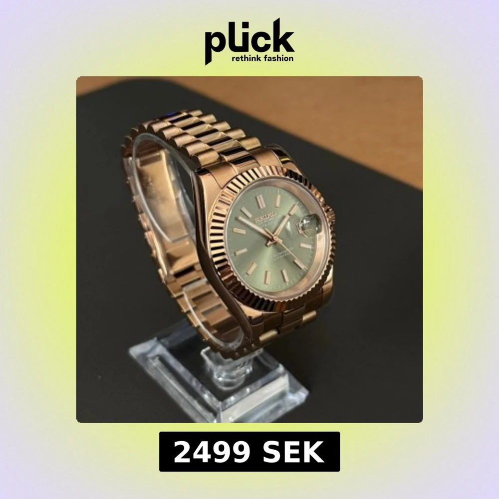Snygg Seiko Datejust med guldigt armband i metall och en stilren grön urtavla. Klockan har räfflad bezel, datumfönster med förstoringsglas och klassisk länkdesign. Perfekt accessoar för dig som vill sticka ut med en elegant och modern look.