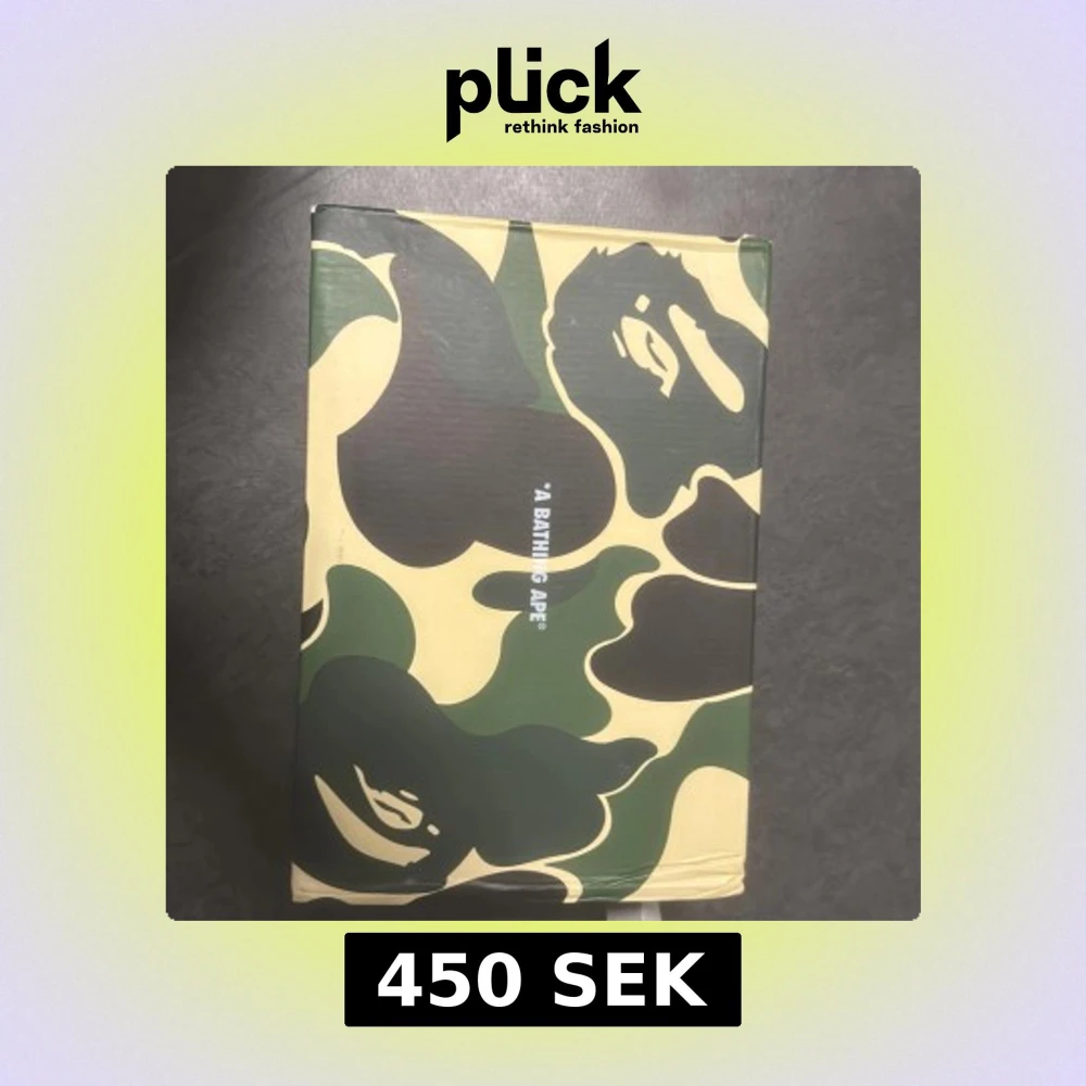 En skokartong från A Bathing Ape med deras ikoniska kamouflagemönster i grönt, beige och svart. Kartongen har tydliga logotyper och mönster som är typiska för märket.