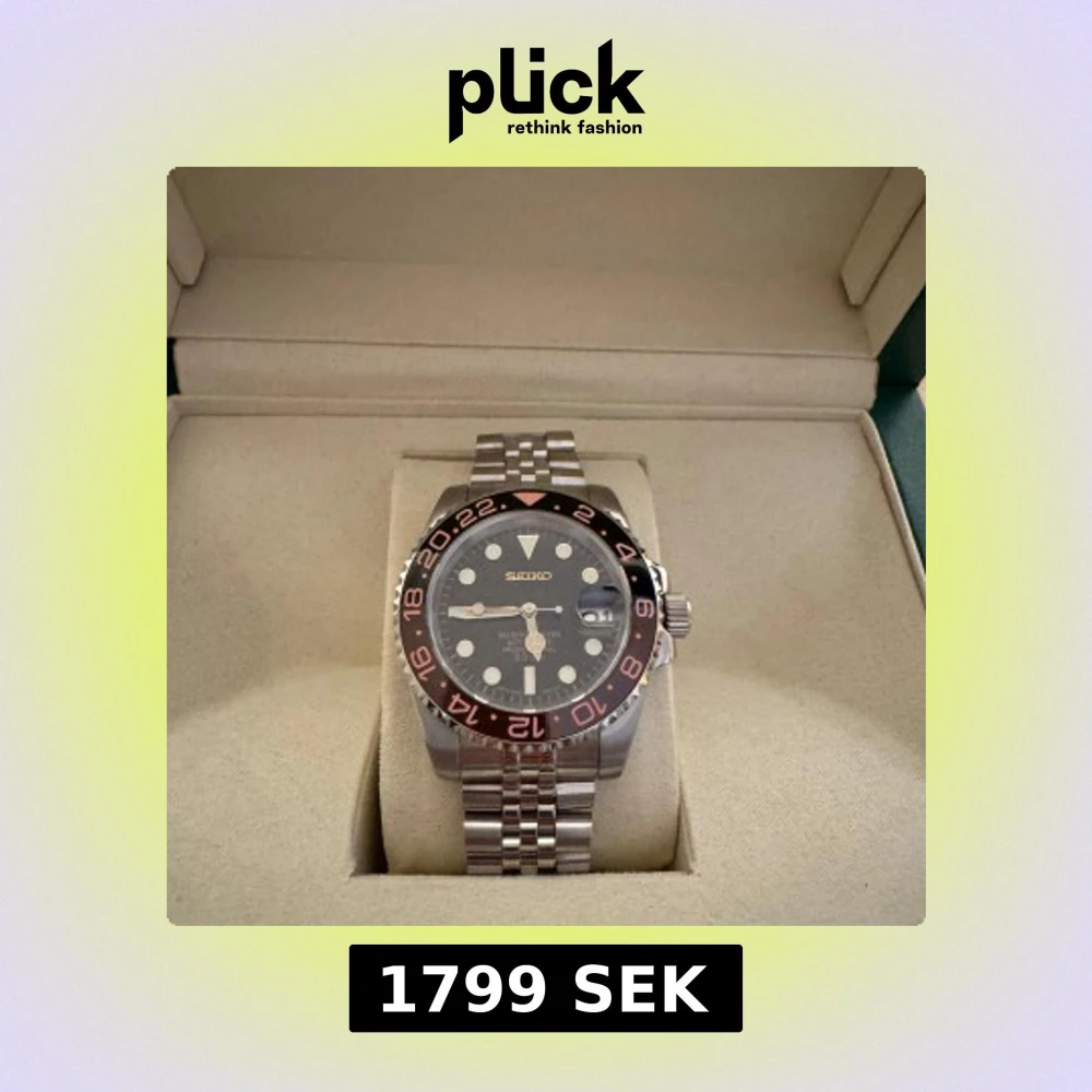 Säljer en stilren Seiko klocka med en svart urtavla och en röd-svart bezel. Klockan har en robust länkarmband i silverfärg och tydliga markeringar på urtavlan. Perfekt för den som söker en kombination av funktion och stil.