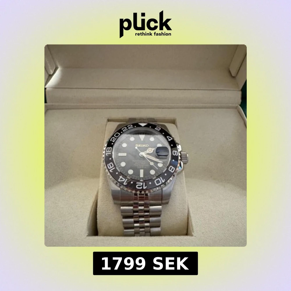 Säljer en stilren Seiko-klocka med svart urtavla och silverfärgad boett. Klockan har en tydlig 24-timmarsmarkering på ringen och ett robust armband i silver. Perfekt för den som söker en kombination av funktion och stil.