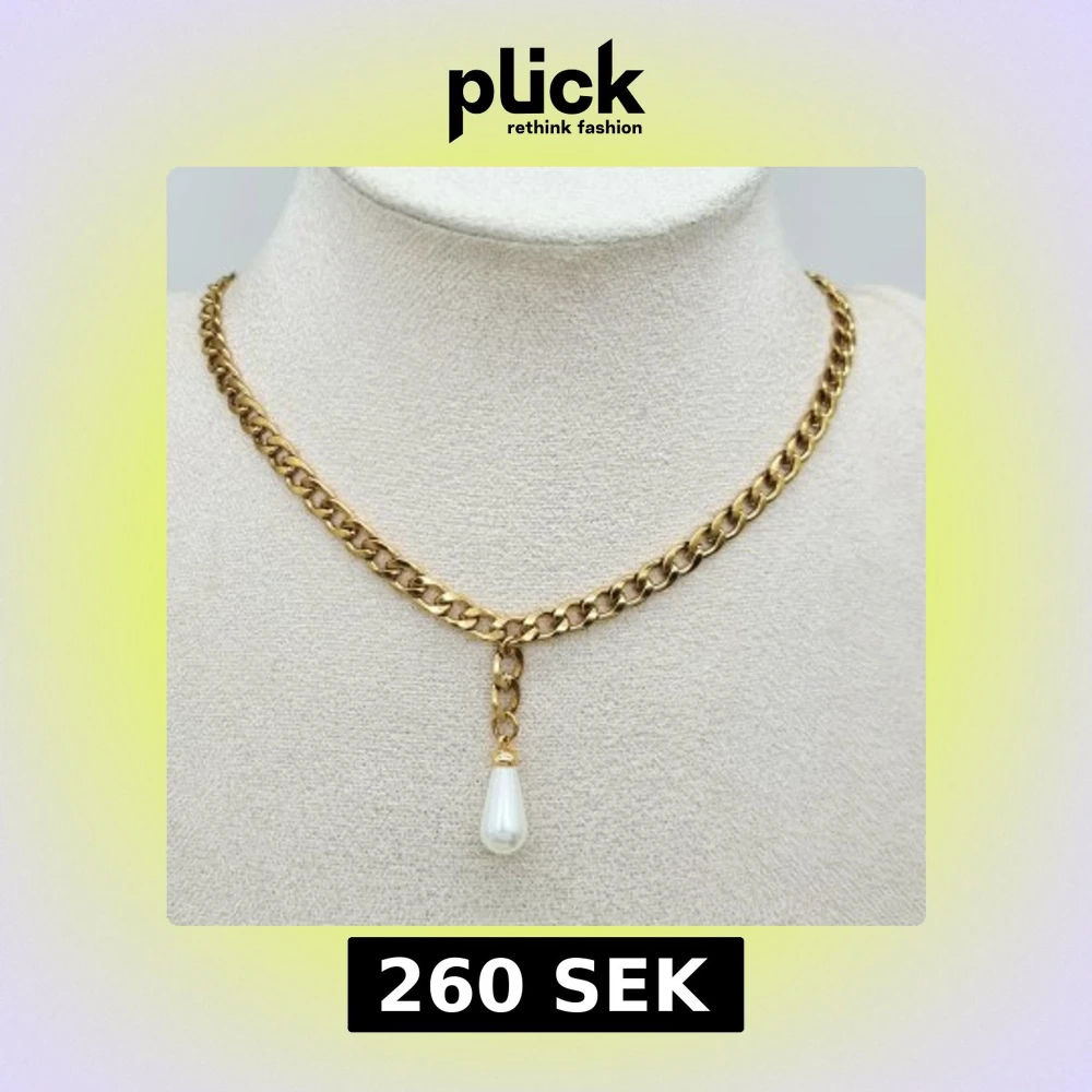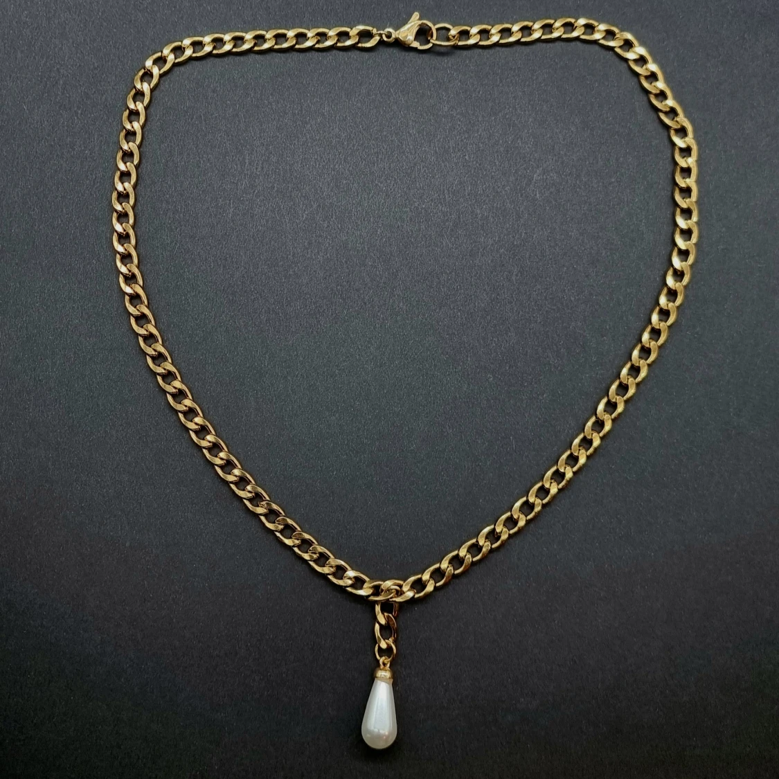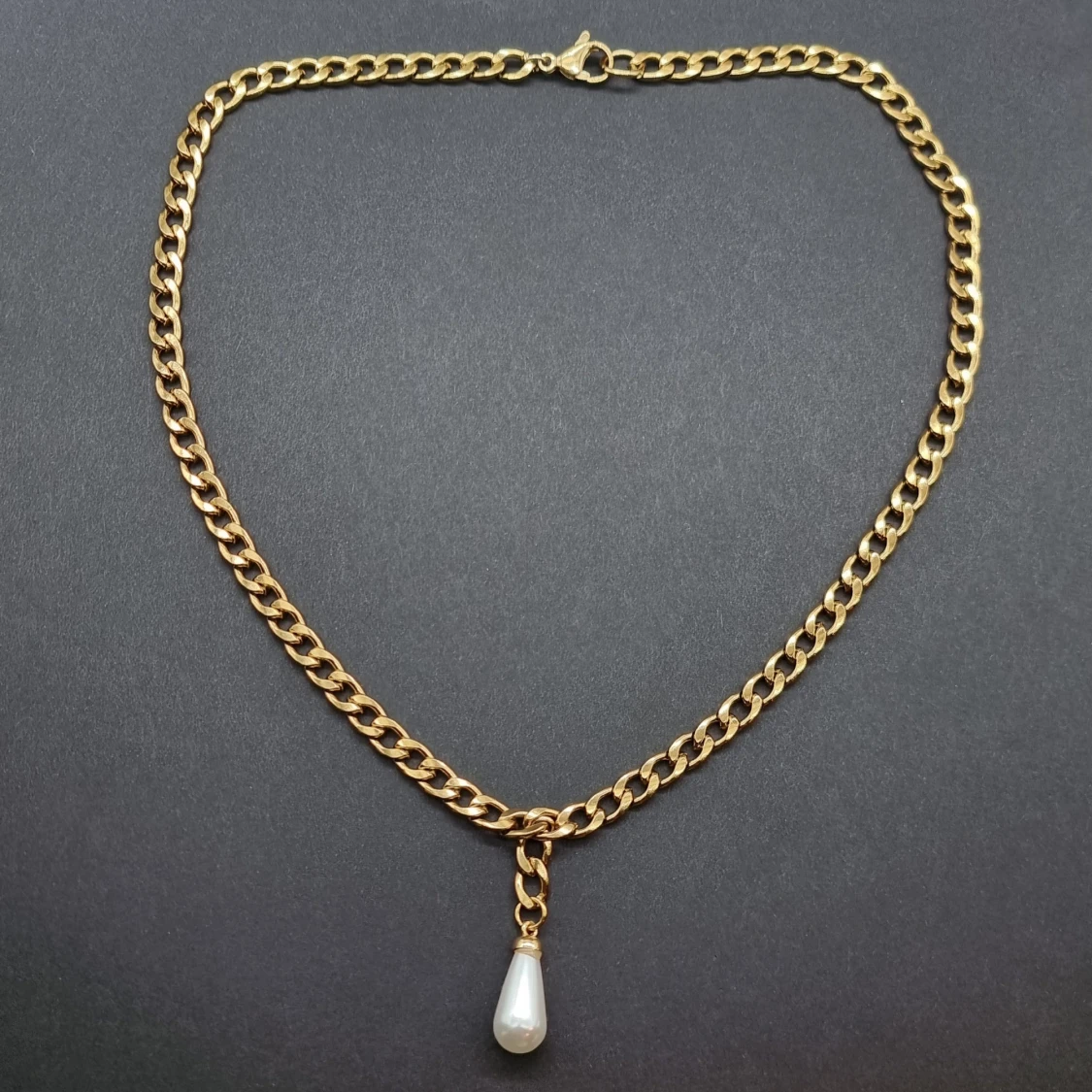 Stilrent halsband i guldfärgad kedja med ett droppformat vitt pärlhänge som ger en elegant vibe. Rostfritt stål.