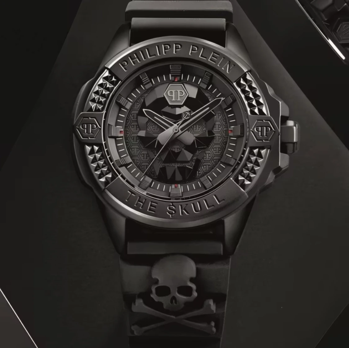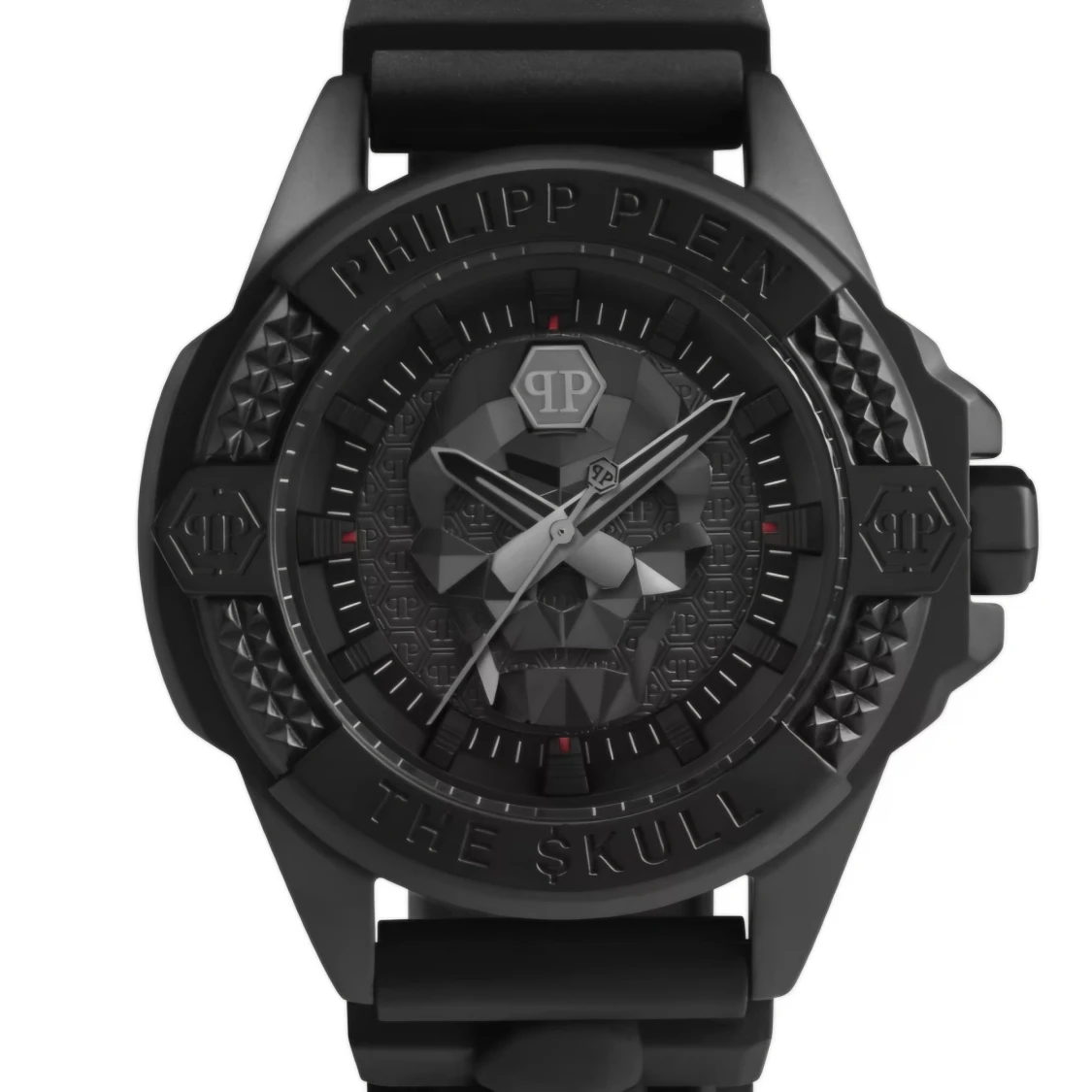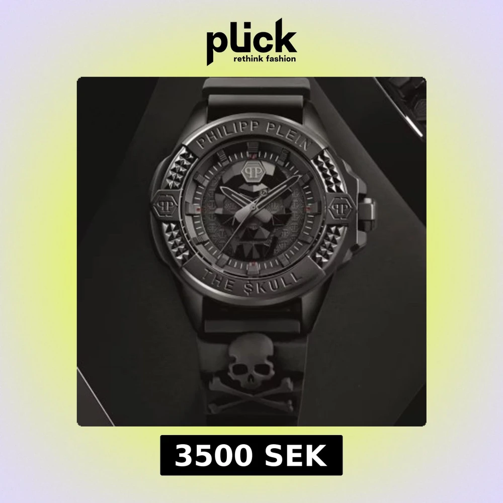 Riktigt fet svart klocka från Philipp Plein med cool döskalle på urtavlan och armbandet. Klockan har detaljerade nitar runt boetten och tydlig logga. Armbandet är i matt svart material och hela looken är mörk och edgy. Perfekt för dig som gillar statement-accessoarer.