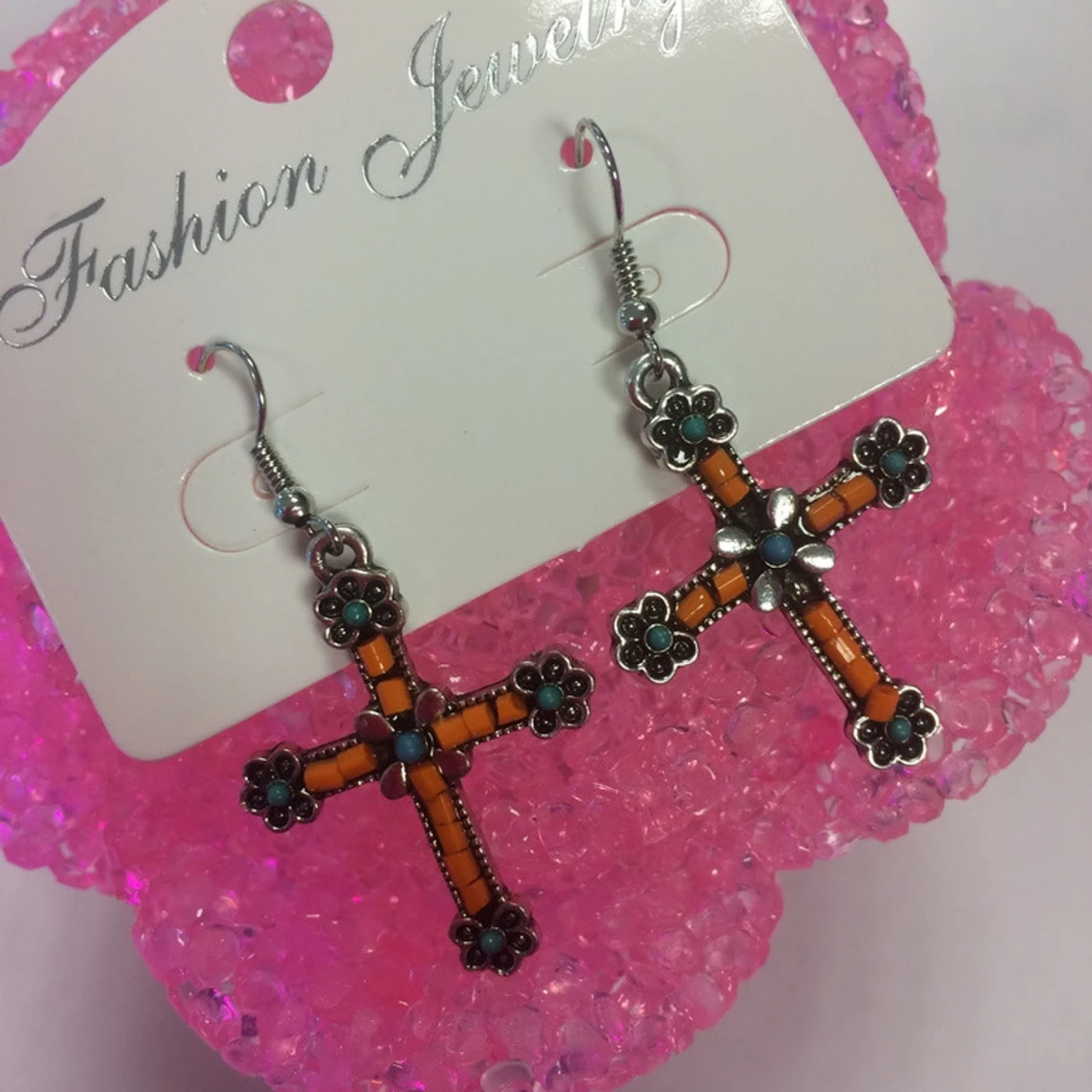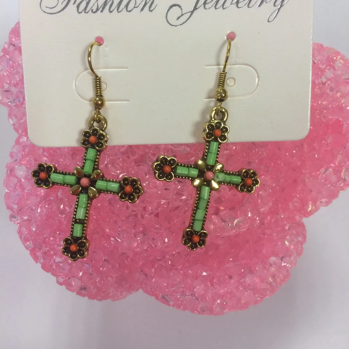 Snygga korsformade örhängen i två olika färgkombinationer. Det ena paret har gröna och guldiga detaljer, medan det andra har orange och silverfärgade detaljer. Perfekta för att ge en färgklick till din outfit! 39kr/pair , helt ny
