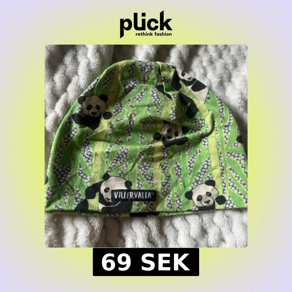 Säljer en cool mössa från Villervalla i ekologisk bomull. Mössan har ett färgglatt mönster med pandor och bambu i grönt, svart och vitt. Perfekt för dig som gillar djurmotiv och vill sticka ut lite extra. Passar både barn och ungdomar.