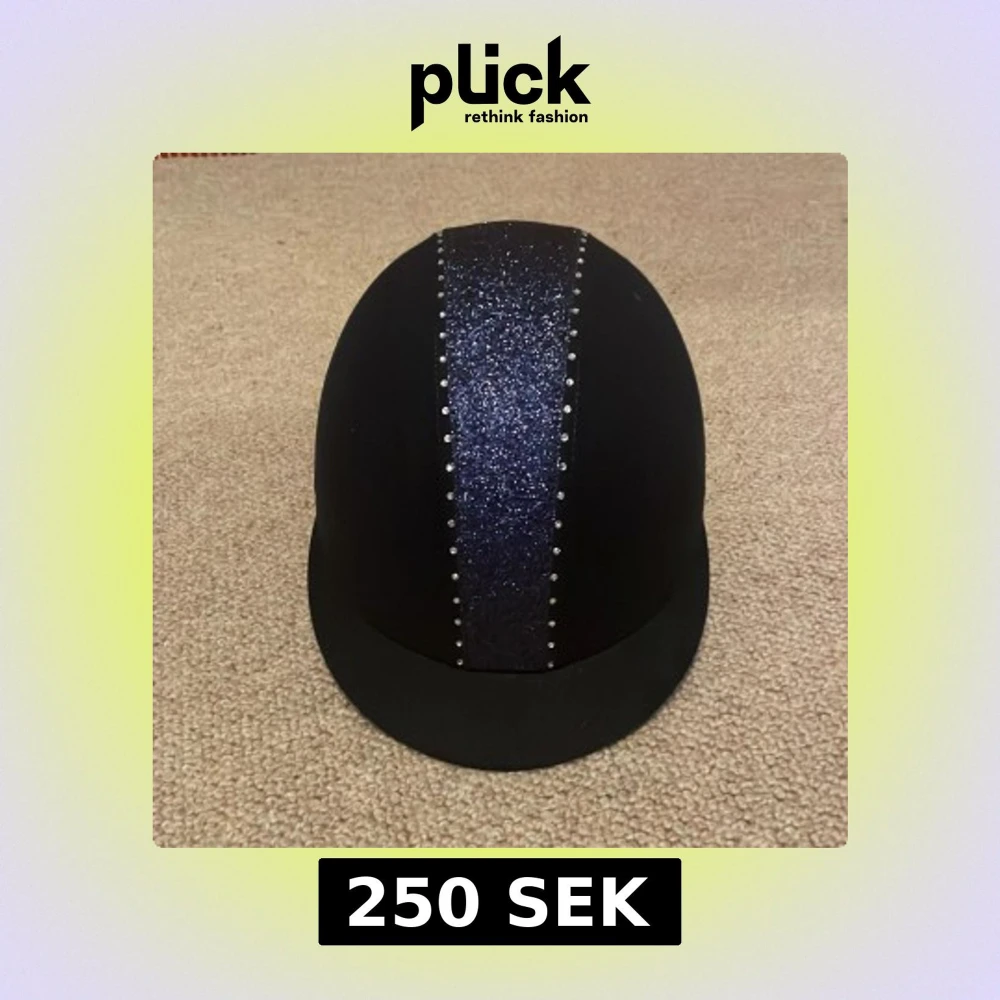 Snygg svart ridhjälm med bred glittrig mörkblå rand framtill och små glittrande stenar längs sidorna. Hjälmen har klassisk form och medföljer en svart dragskopåse för förvaring. Perfekt för dig som vill sticka ut i stallet. Hjälmen är använd fåtal gånger och är i nytt skick!