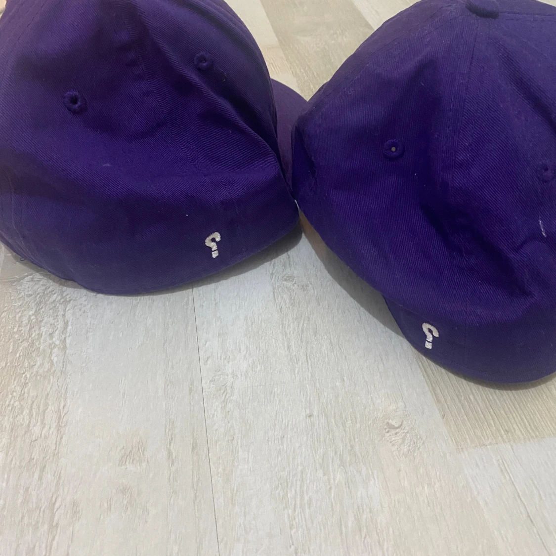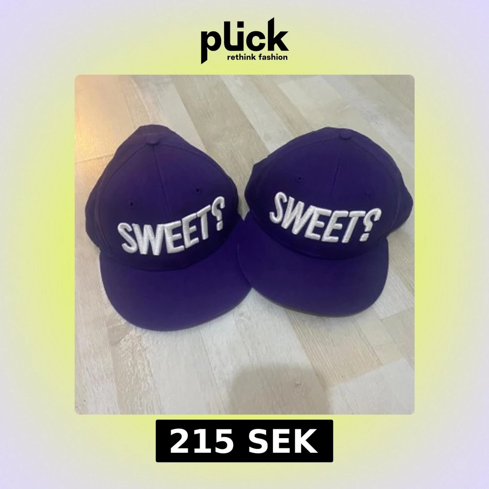 Säljer en lila keps från Sweet Skateboards med vit broderad text 'SWEET?' framtill och ett litet frågetecken bak. Klassisk modell med böjd skärm och svart/vit logotyp på insidan. Perfekt för dig som gillar streetwear och skatekultur.