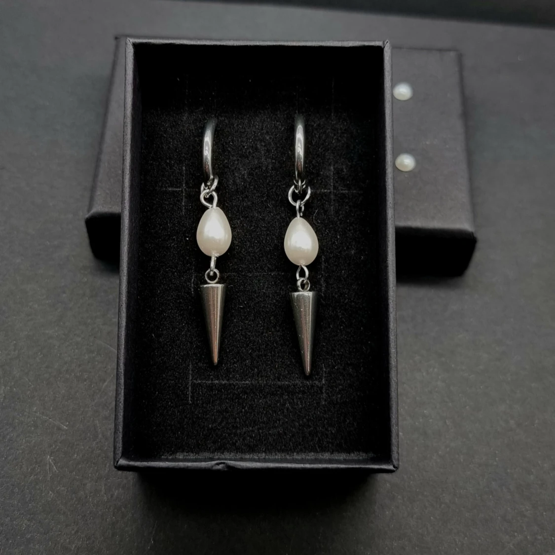 Snygga örhängen i silverfärg med droppformade vita pärlor och coola spetsiga spikes. Rostfritt stål. Längd-5cm