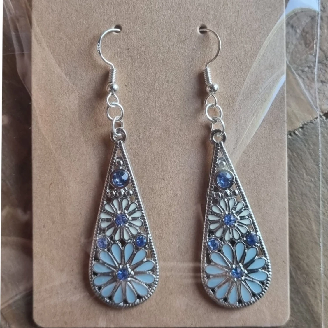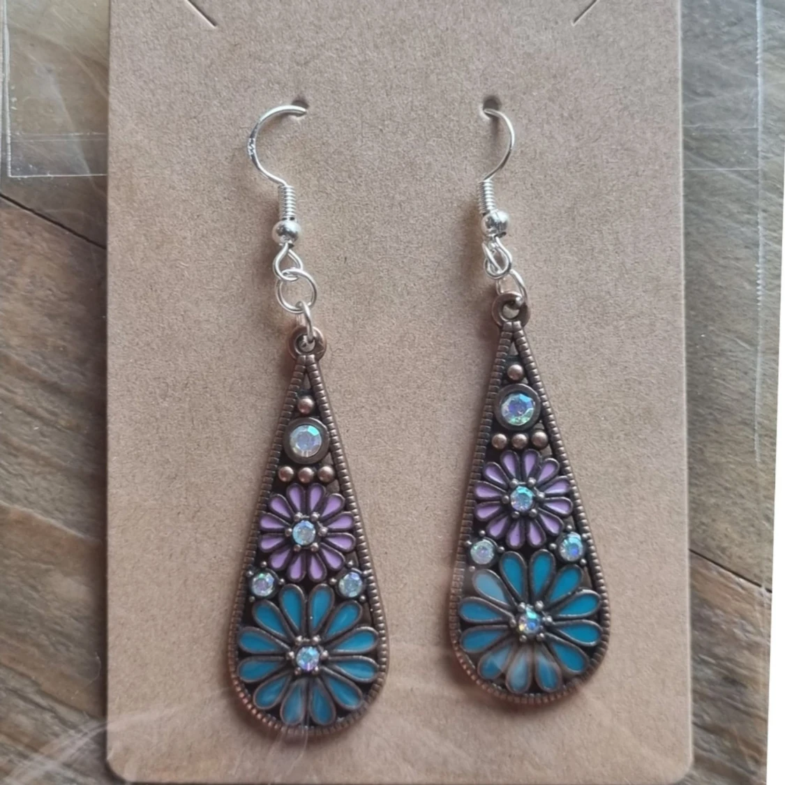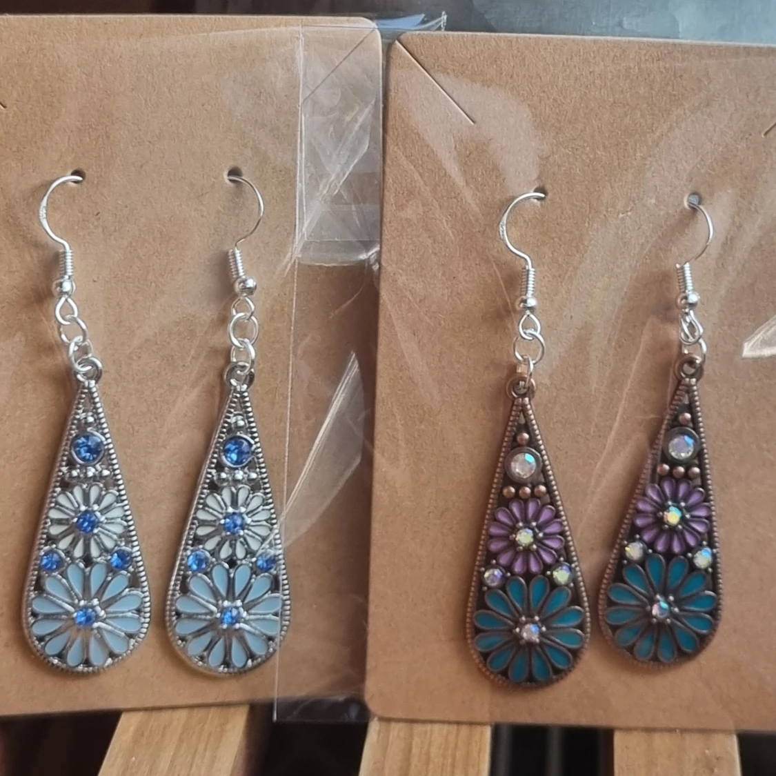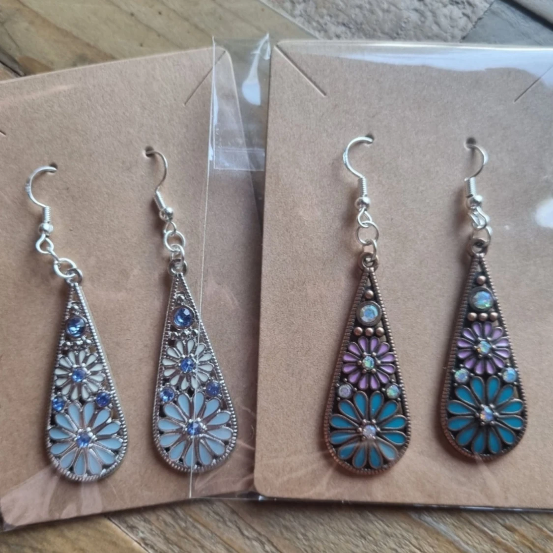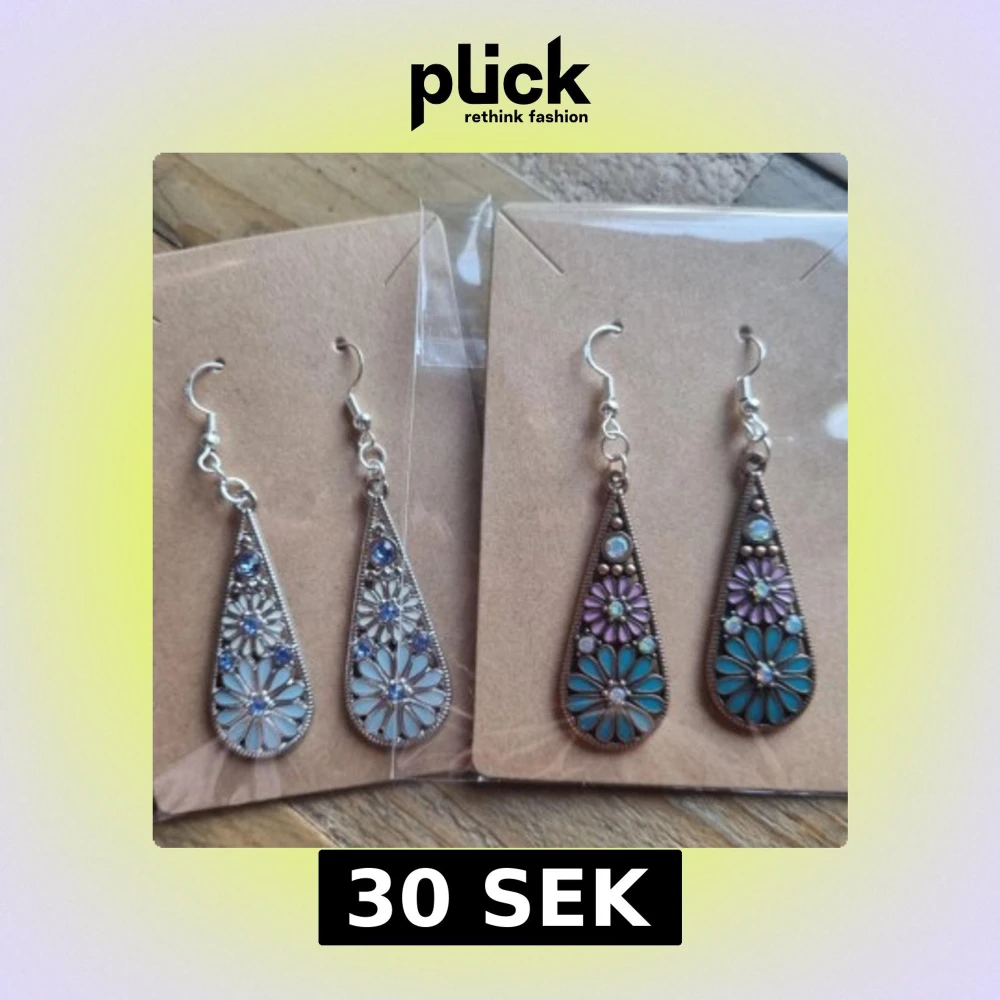 Två par vackra örhängen med blommönster. Finns i två olika färgställningar. Örhängenskrokar gjorde av koppar. Längd 6,5 cm. Lätt vikt