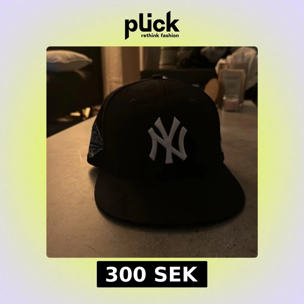 Snygg svart keps med vit broderad logotyp på framsidan. Kepsen har en platt skärm och detaljer på sidan som refererar till World Series. Insidan av skärmen har ett mönster i ljusare färger.