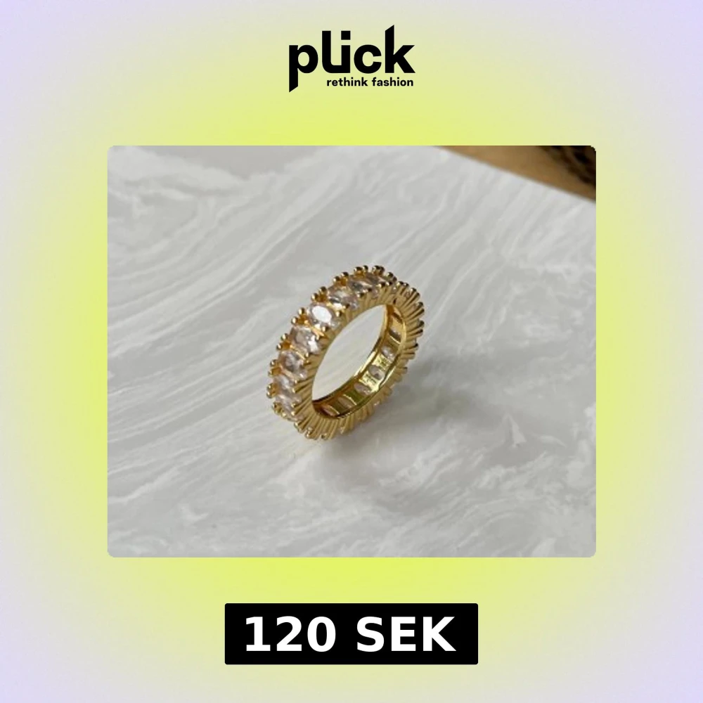 En chunky guldfärgad ring med gnistrande klara stenar runt hela bandet. Ringen har en lyxig känsla med sina stora, facetterade stenar som fångar ljuset snyggt. Perfekt för dig som vill sticka ut med ett statement-smycke.