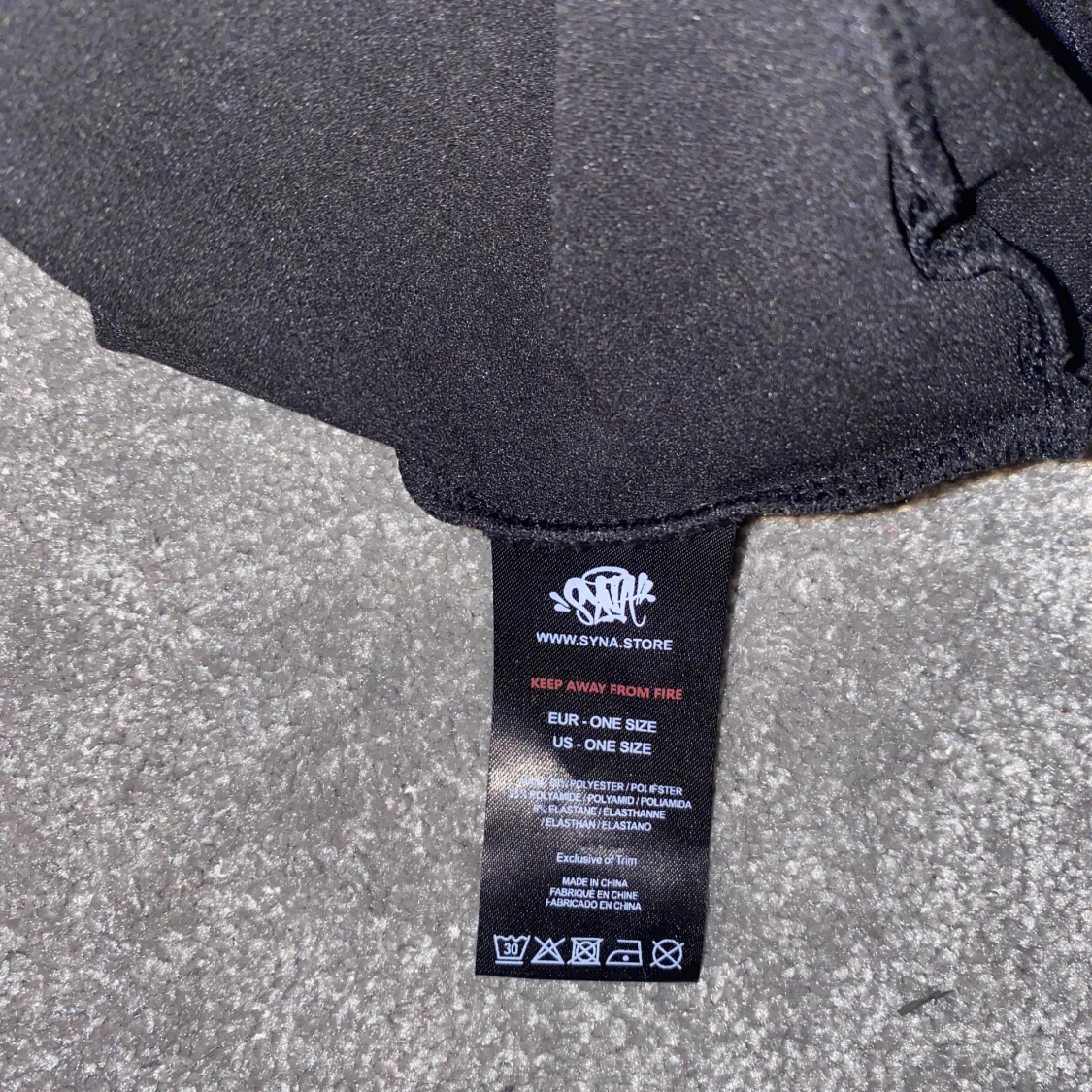 Svart mössa från SYNA med stilren, böjd form och en grå logga i graffiti-stil framtill. Tillverkad i mjuk polyester och elastan som sitter skönt på huvudet. Perfekt för dig som gillar streetwear och vill ha en enkel men snygg accessoar.har ej påsen