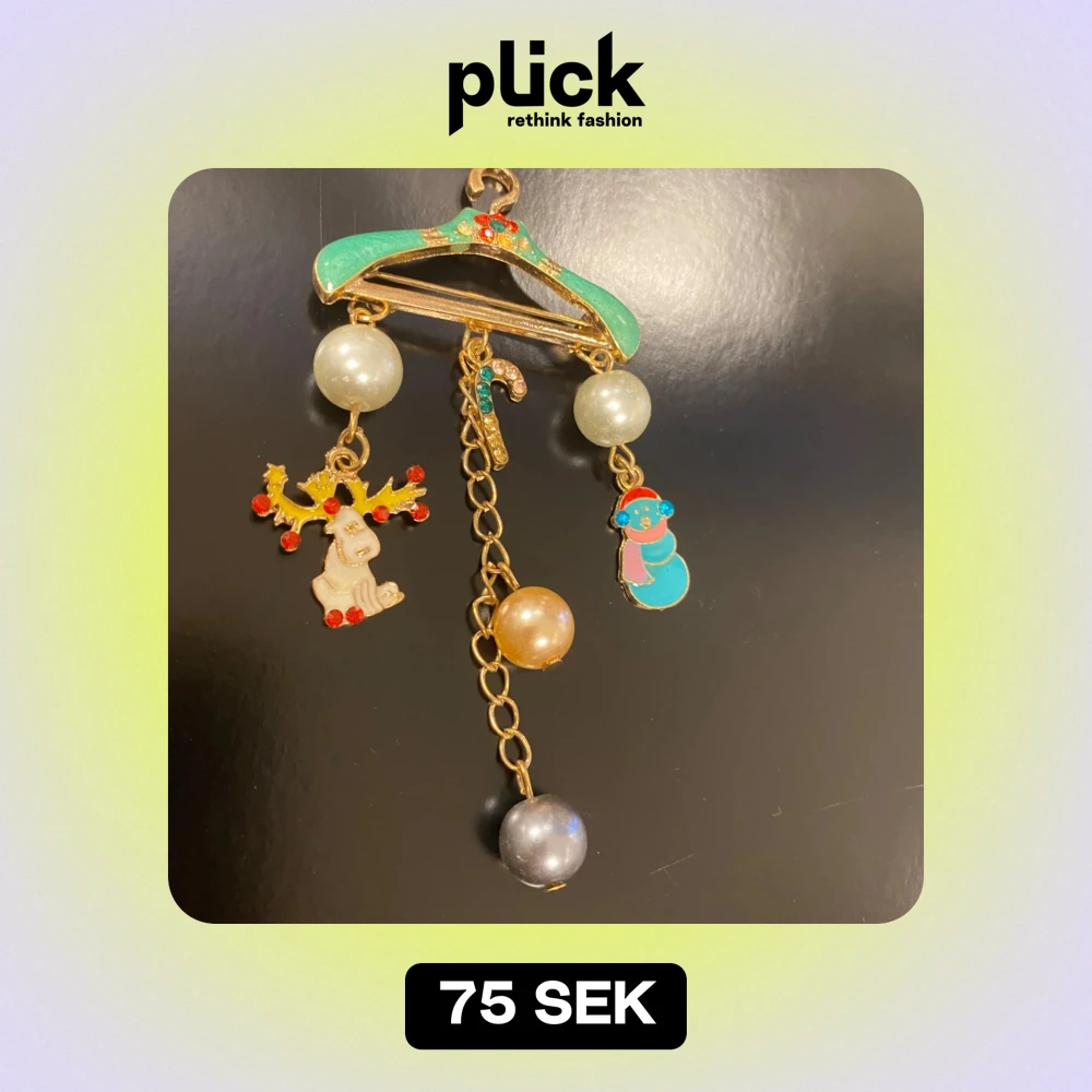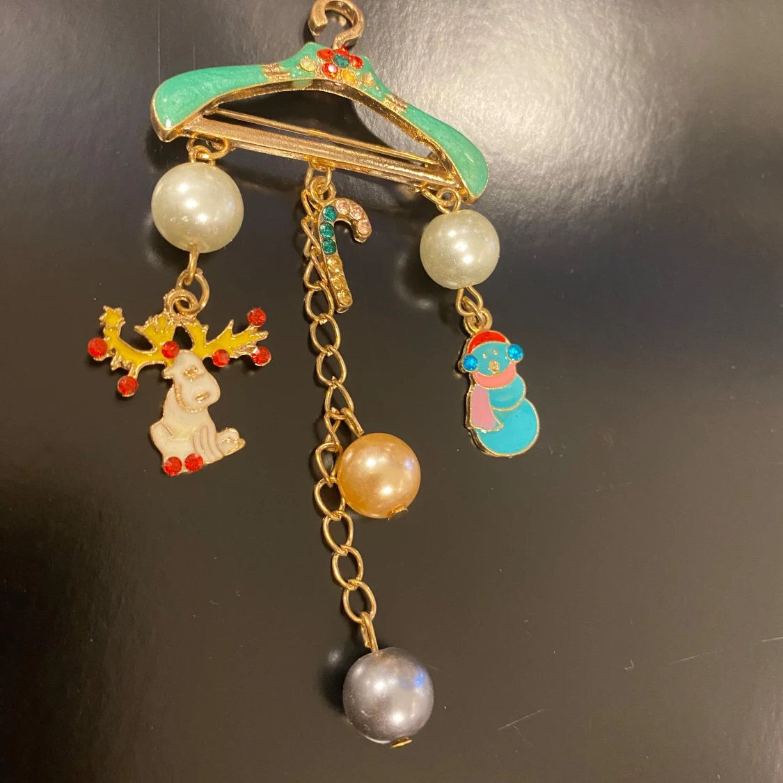 Charmigt hängsmycke med julmotiv. Smycket har en grön galge med hängande dekorationer: en ren med röda detaljer, en snögubbe i blått och en polkagris. Pärlor i olika färger ger extra glans. Perfekt för att sprida julstämning!