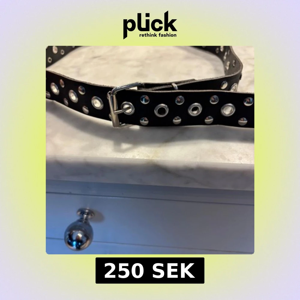 Svart bälte med dubbla rader av stora och små silverfärgade nitar och hål längs hela längden. Snyggt metallspänne i silver. Perfekt för att ge din outfit en edgy vibe. Bältet är ca 75 cm långt och har en klassisk rak form. Aldrig använt