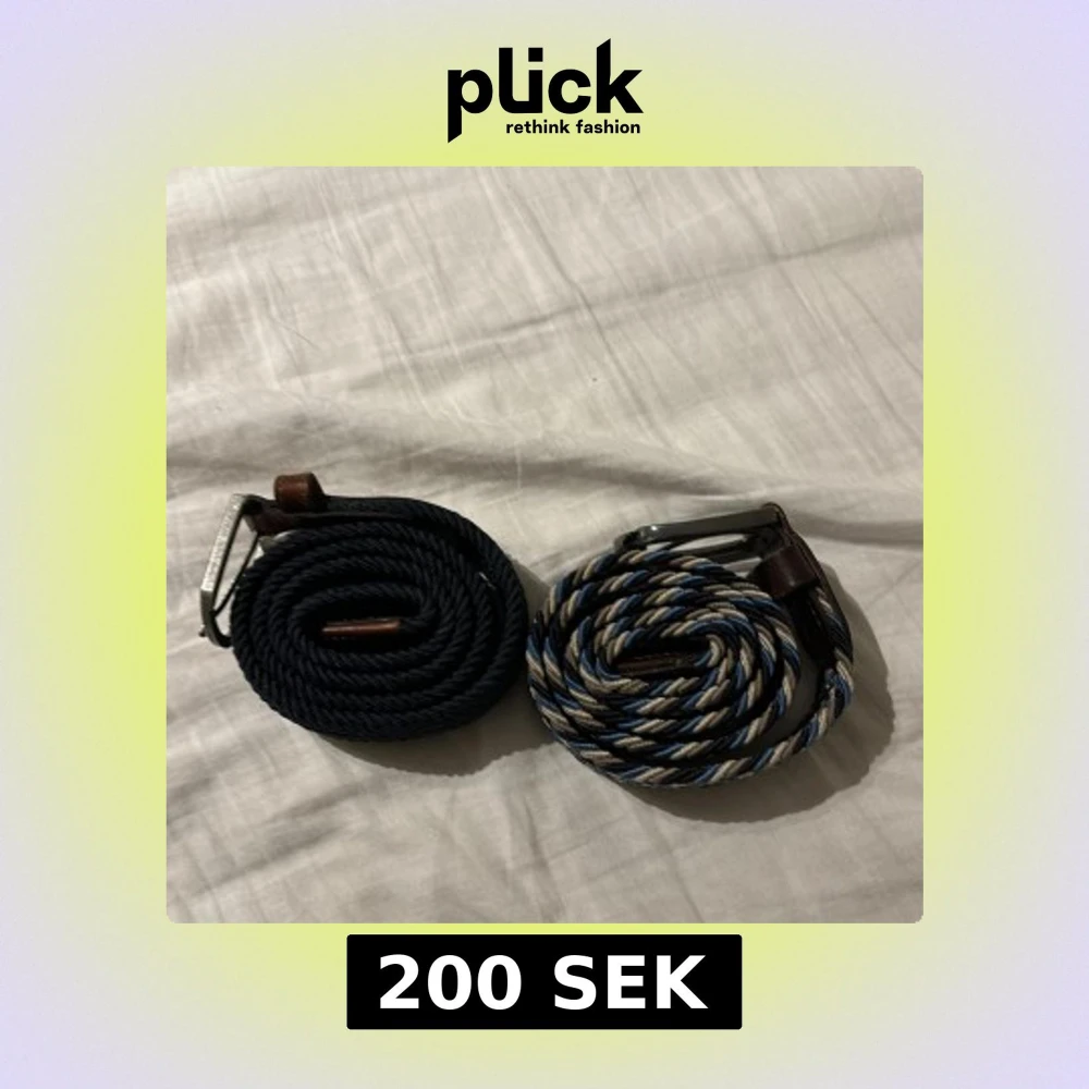 Säljer två snygga flätade bälten med metallspänne. Det ena är enfärgat mörkblått och det andra har ett randigt mönster i blått, beige och vitt. Båda bältena har bruna läderdetaljer vid spännet. Perfekta för att ge din outfit en stilren touch! För både kan du köpa för 200