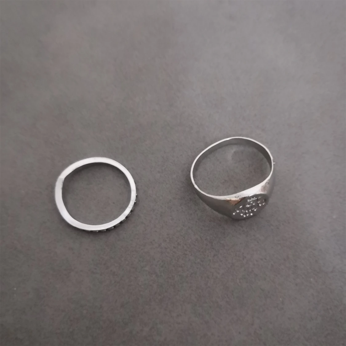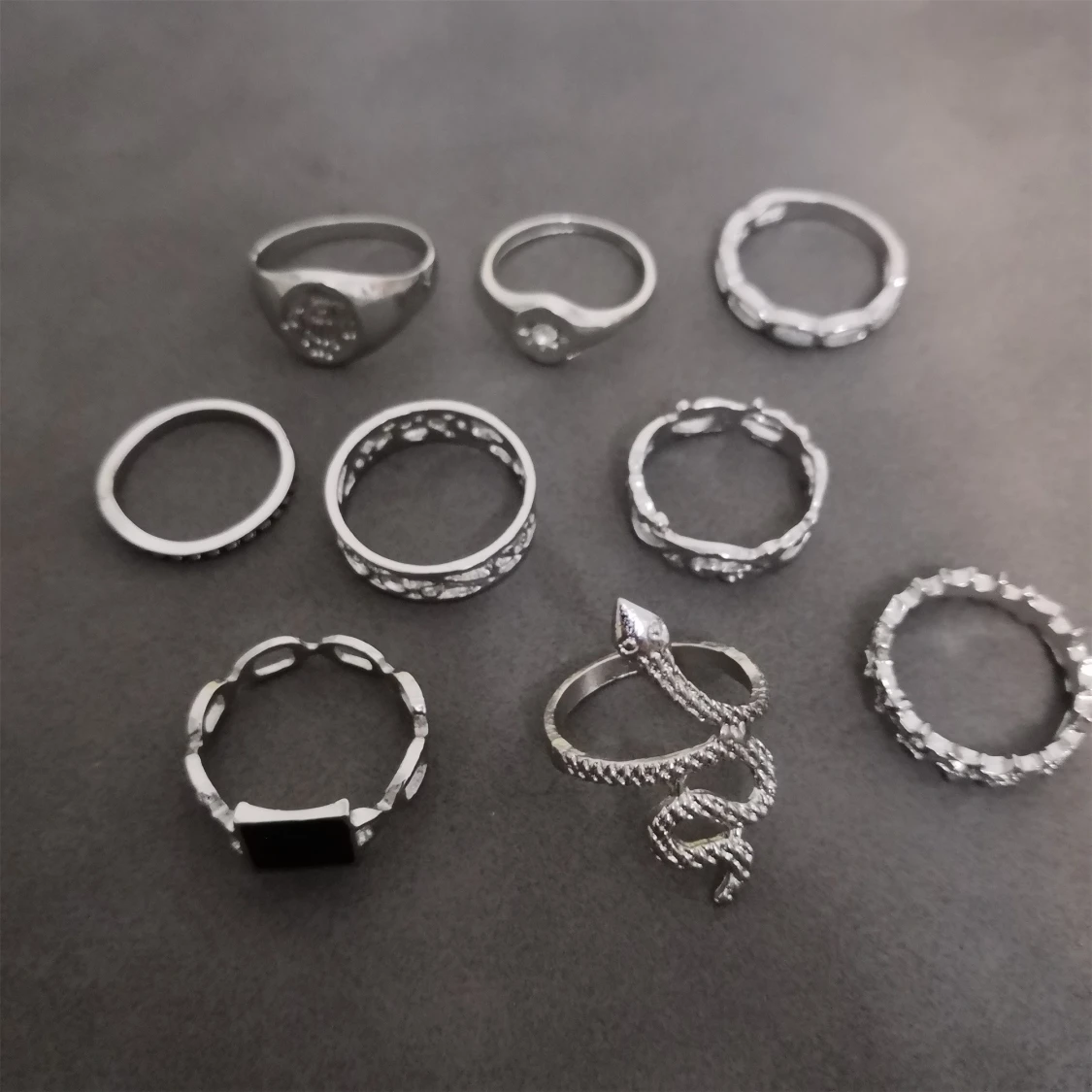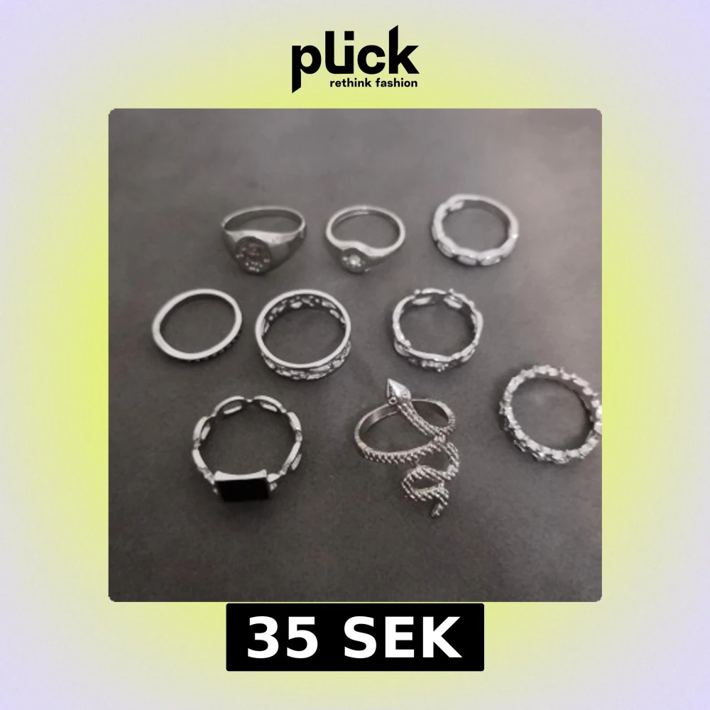 Säljer ett set med 9 st silverfärgade ringar i olika former och mönster. Perfekt för att mixa och matcha till din egen vibe. Materialet är zink alloy. (304)
