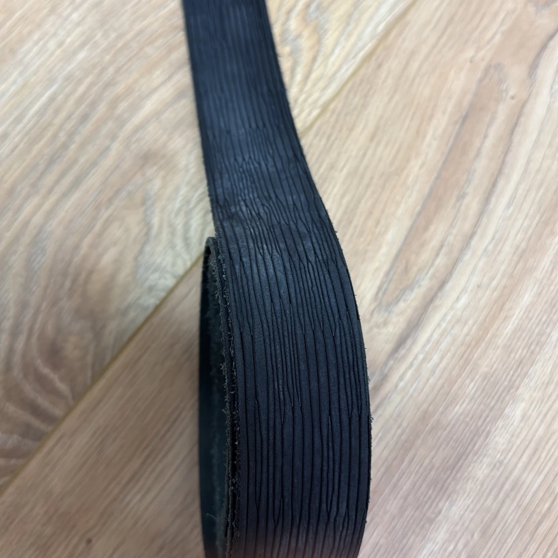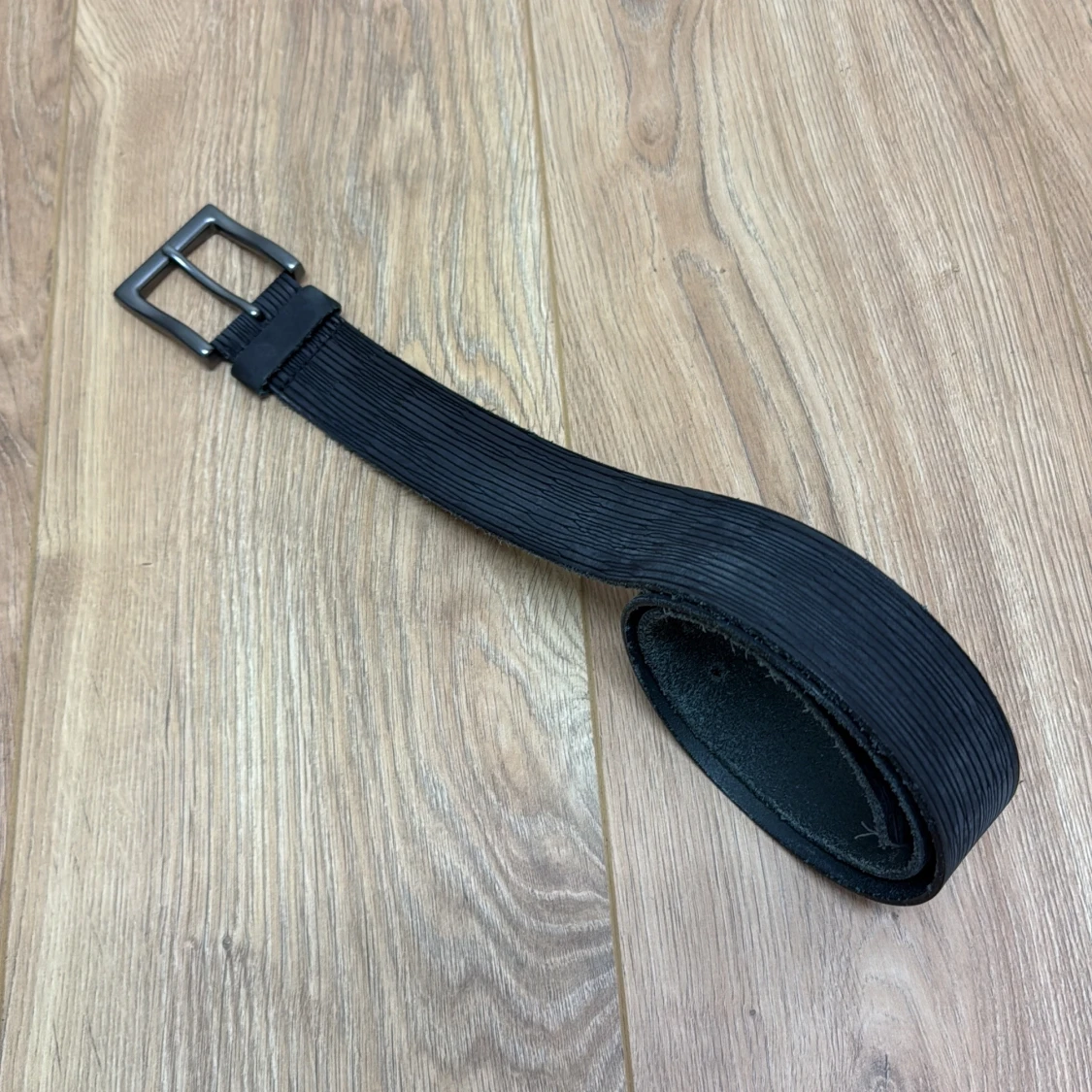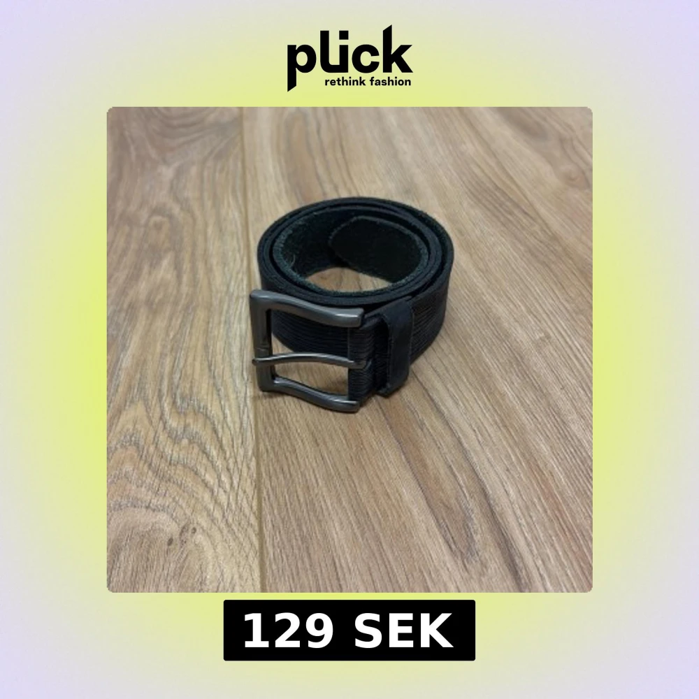 Snyggt svart bälte i skinn med diskret randig struktur längs hela remmen. Bältet har ett stilrent metallspänne i mörkgrått som ger en modern touch. Perfekt accessoar för att lyfta din outfit med en enkel men cool detalj.