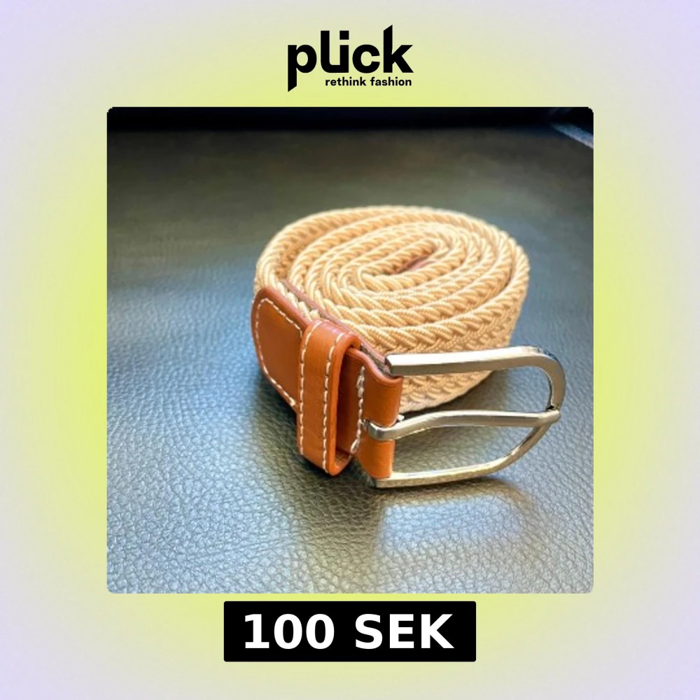 Säljer ett snyggt beige flätat bälte med bruna skinn-detaljer och silverspänne. Bältet har en stilren design och passar perfekt till jeans eller chinos. Flätningen gör det enkelt att justera längden efter behov.