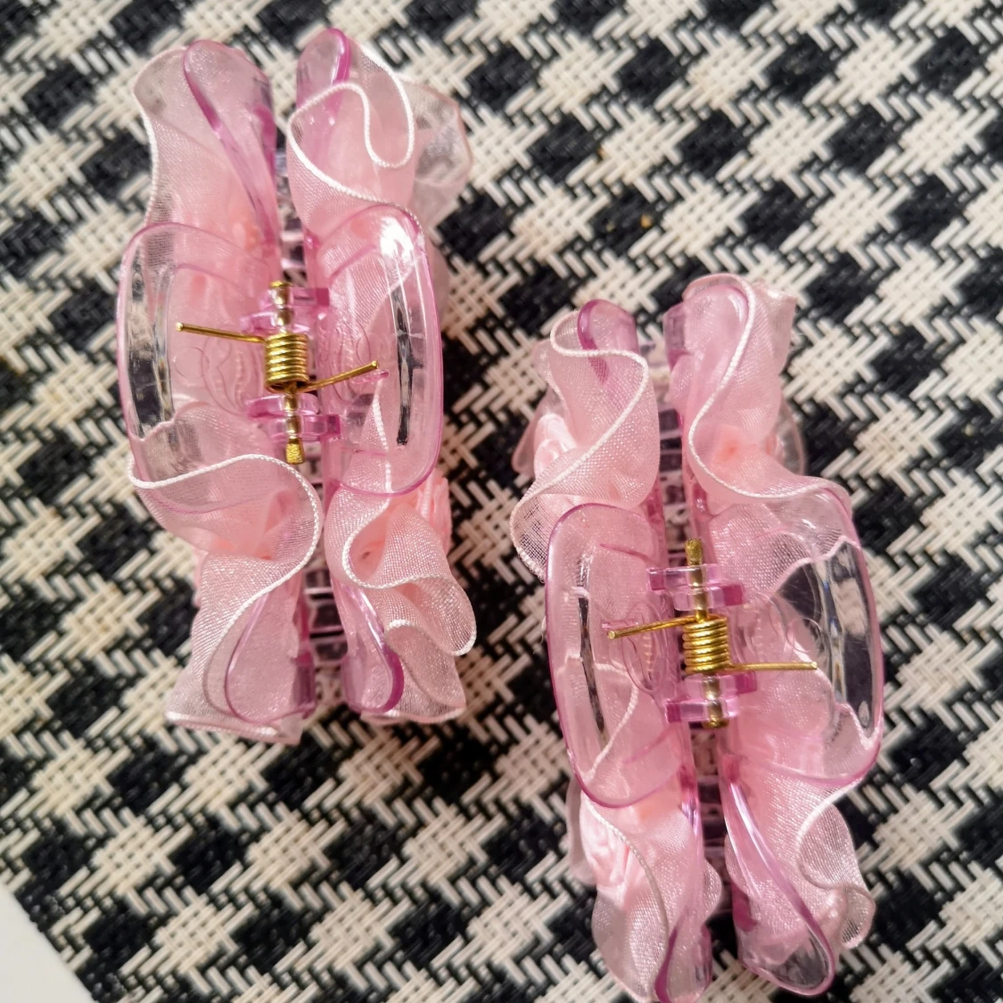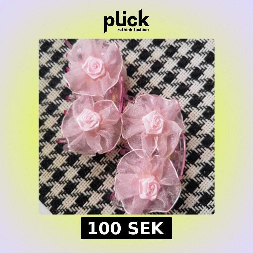 Helt nya. Längd 9cm. Ett par söta hårklämmor i rosa plast dekorerade med stora blommor i tyll och tygrosor. Perfekt accessoar för att ge en gullig och romantisk touch till din look. Blommorna är fluffiga och diademet har en glansig finish.